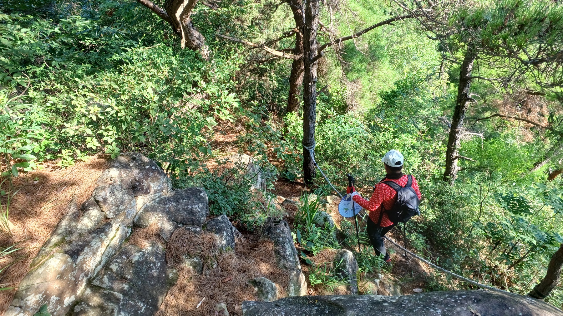 조망 바위에서 조망 후 다시 급경사 내리막 로프 구간을 내려가