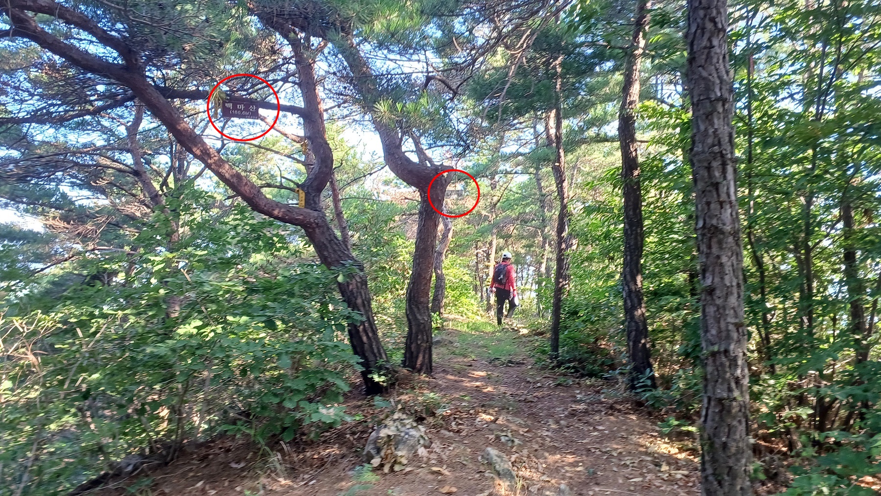 -돌탑-백마산 정상-돌탑1,2-조망바위-하산-로프 구간-'에덴 입구' 표시판-묘소-봉우리(벤치-삼각점)