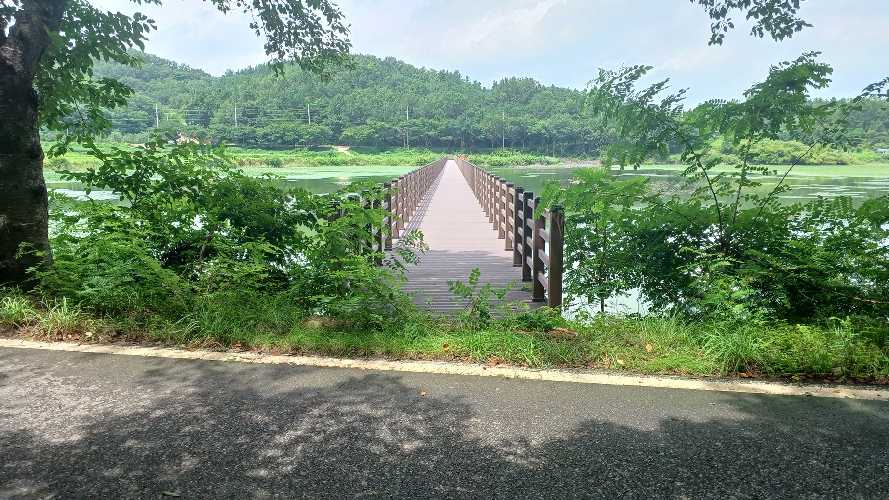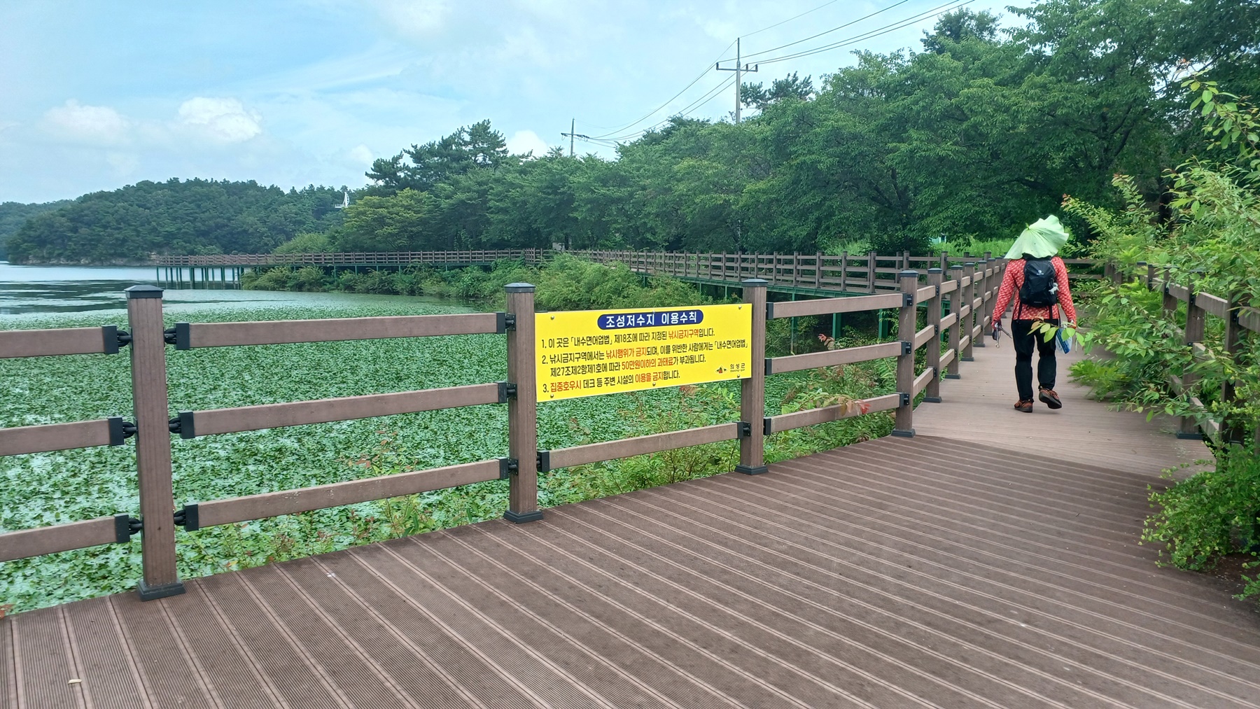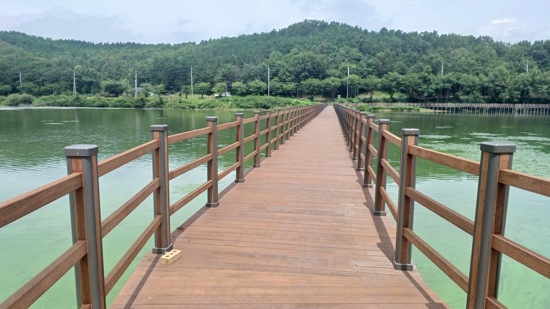 저수지를 가로 지르는 수변 데크 교량이 보이는 방향으로 가서