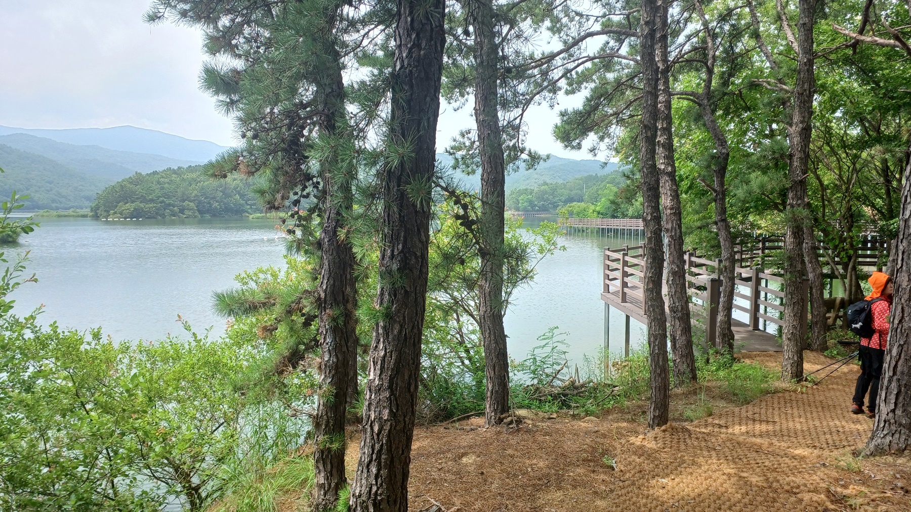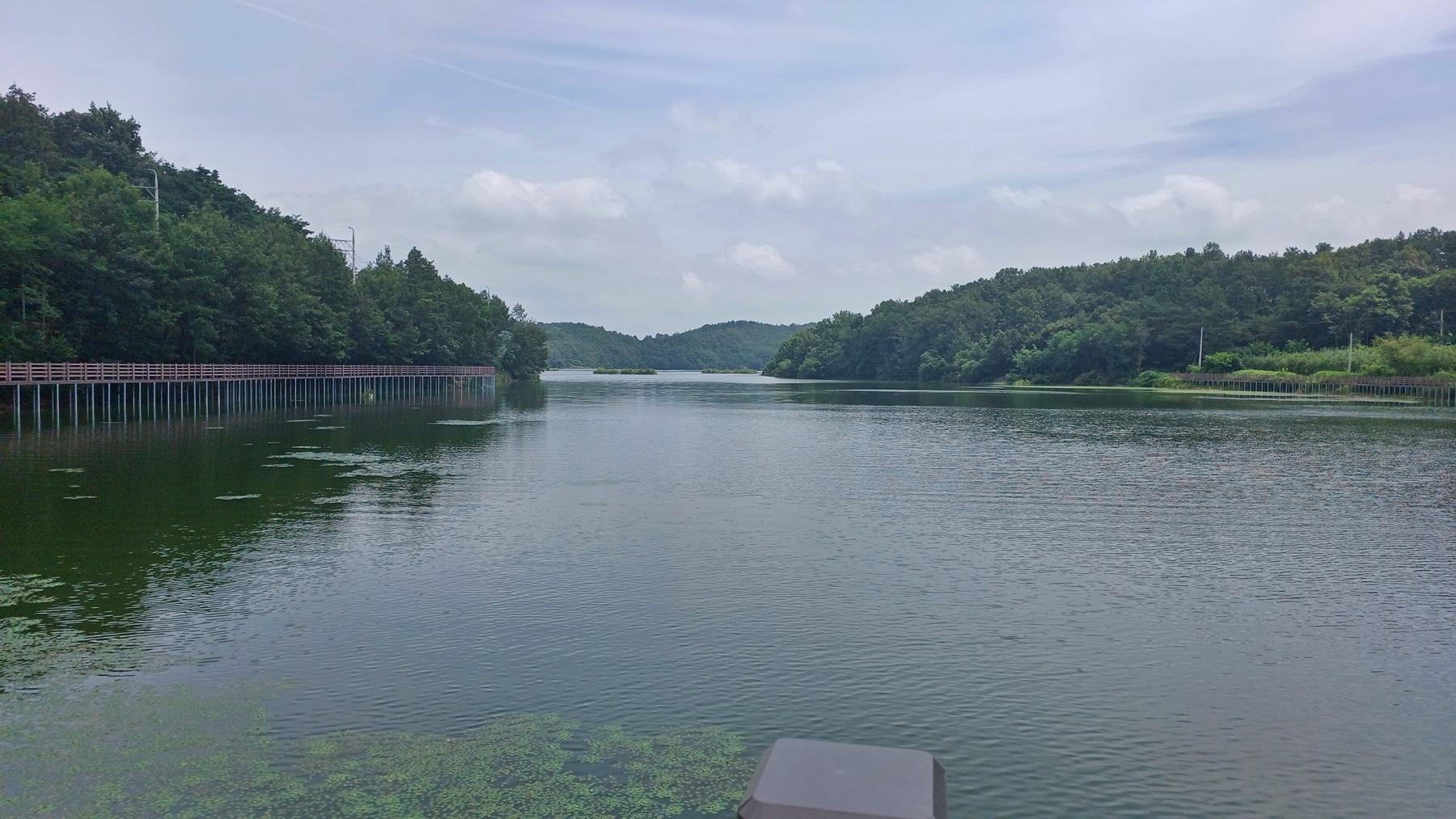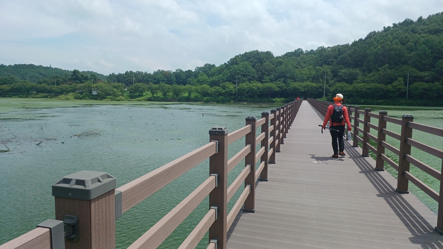 저수지를 가로 지르는 수변 데크 교량이 보이는 방향으로 가서