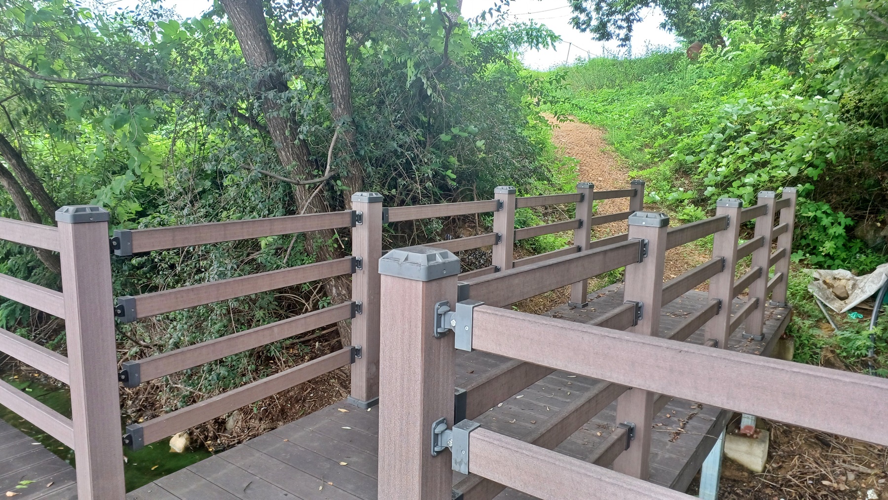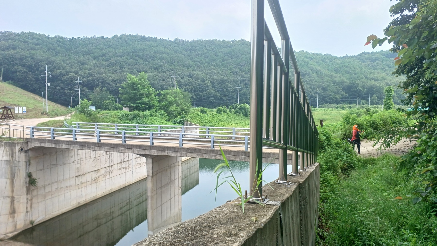 건너편 과수원길과 수조가 있는 도로로 오르는 지점이 보이는 수변 데크길이다.