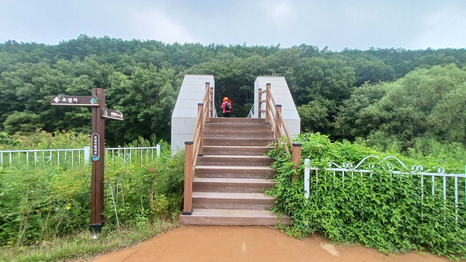 산아래 좌측으로 오르는 데크 계단이 보인다.