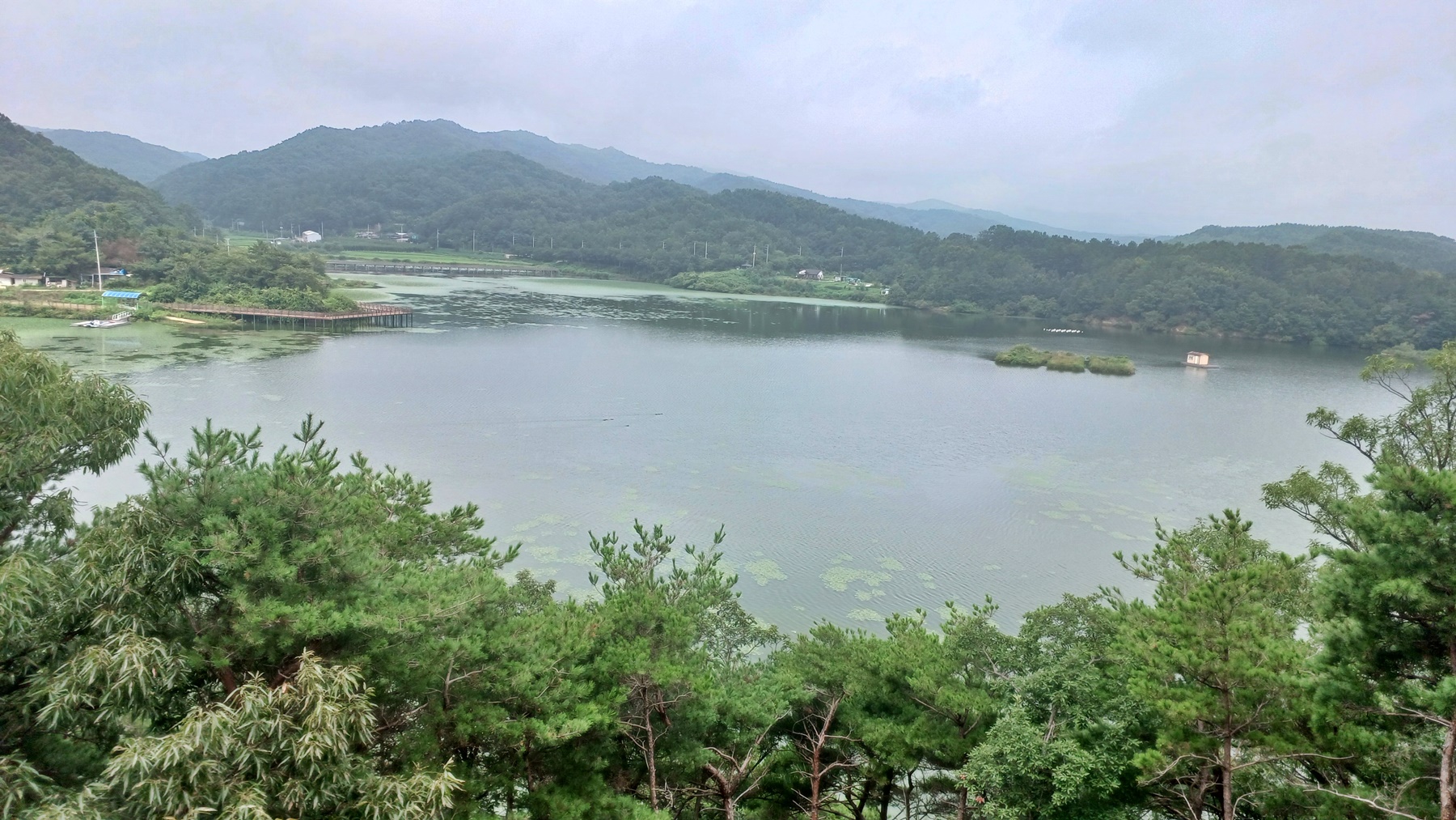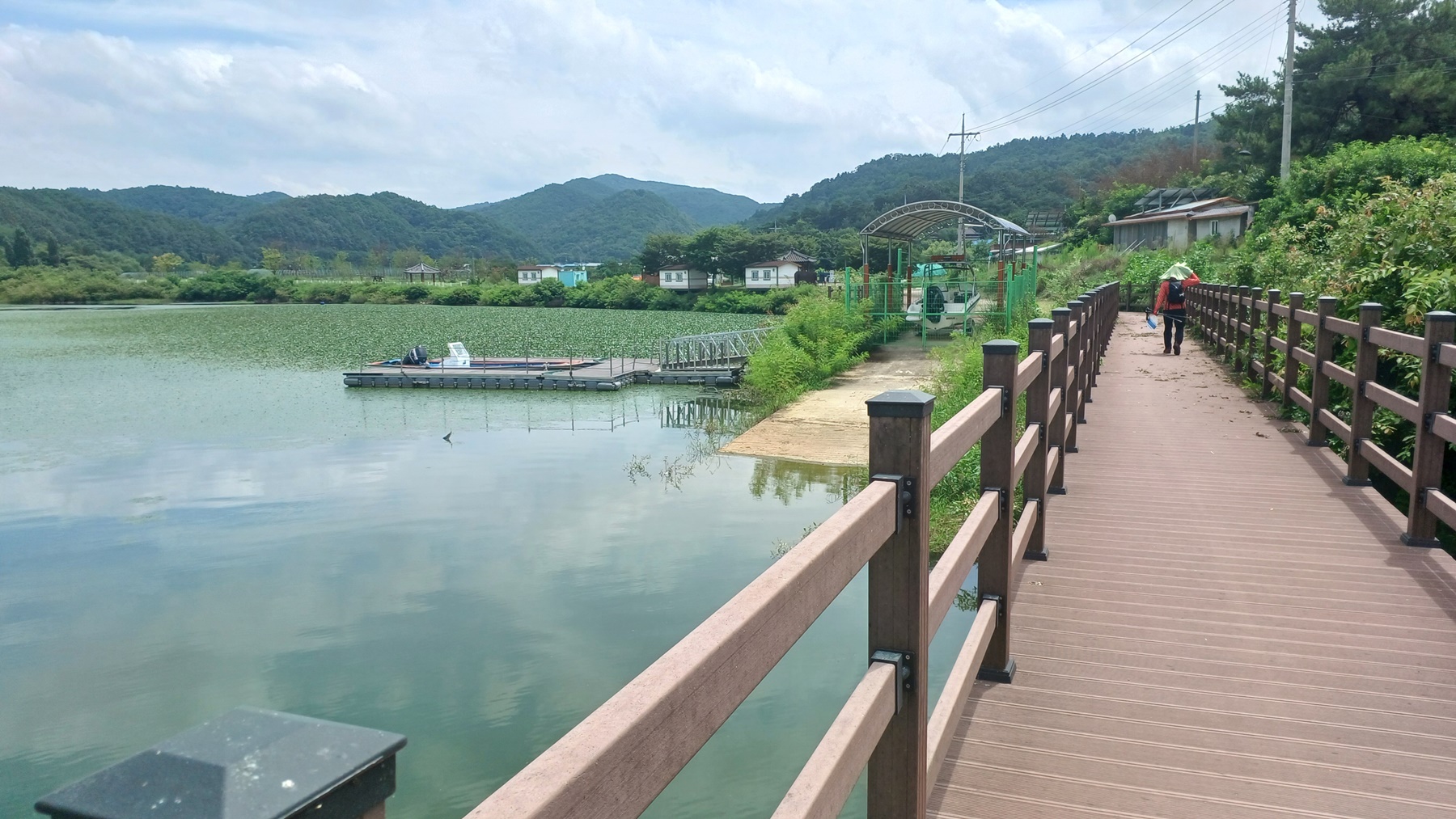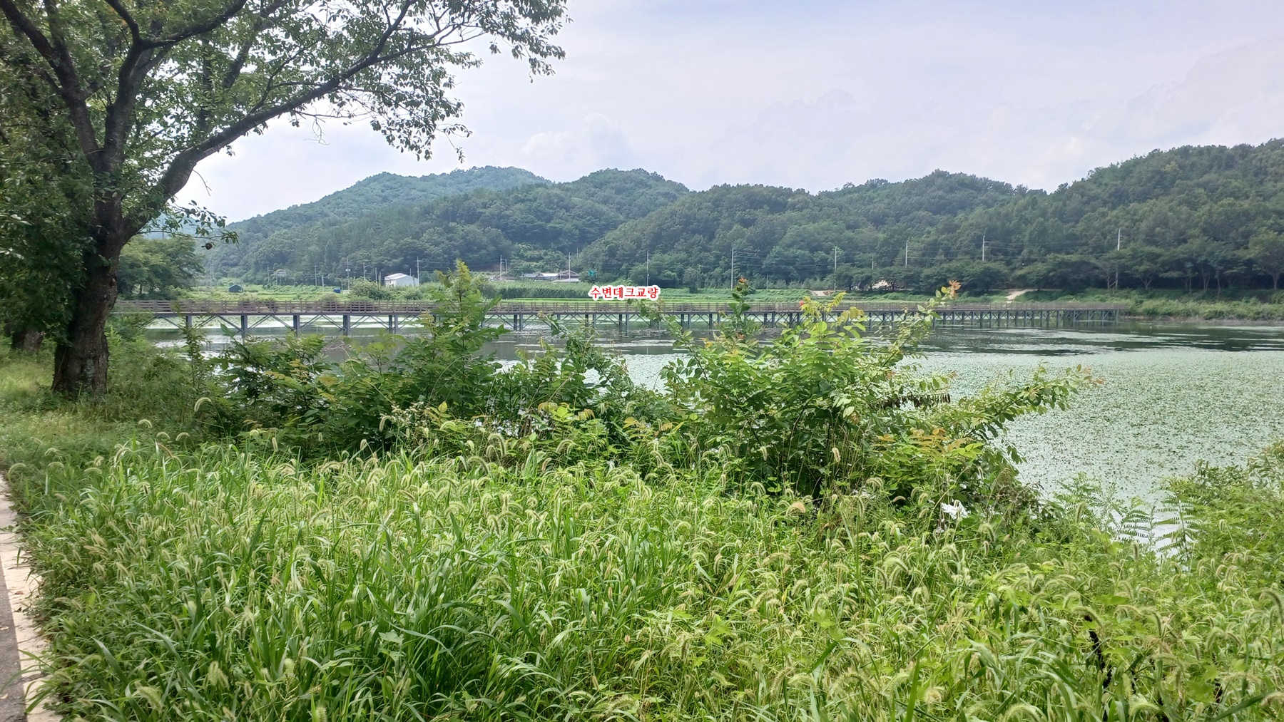 아래에는 수변 데크길과 우측 수변에는 정자가 보인다.