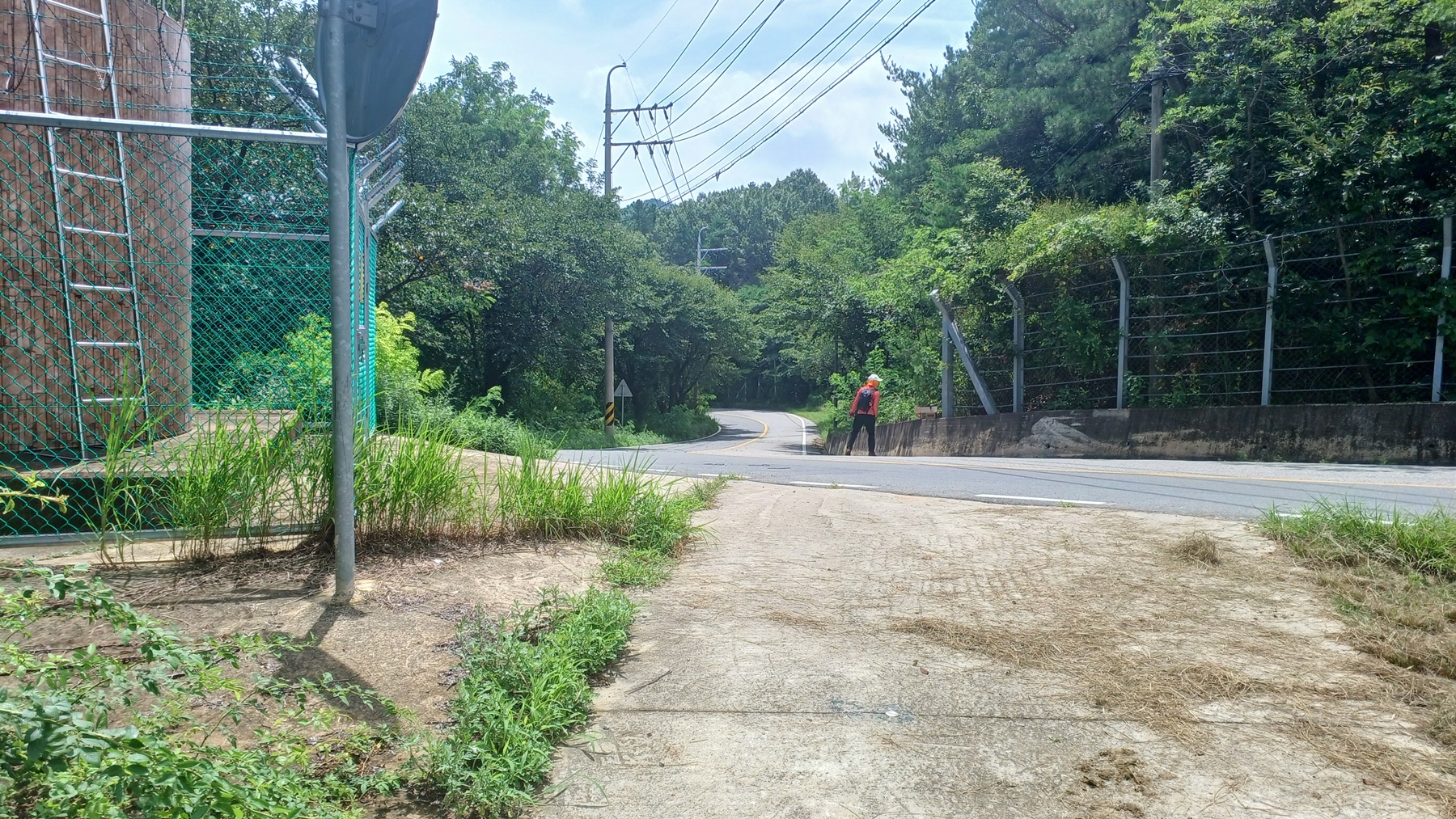 좌측으로 울타리 수조가 위치한 도로에 올라서서