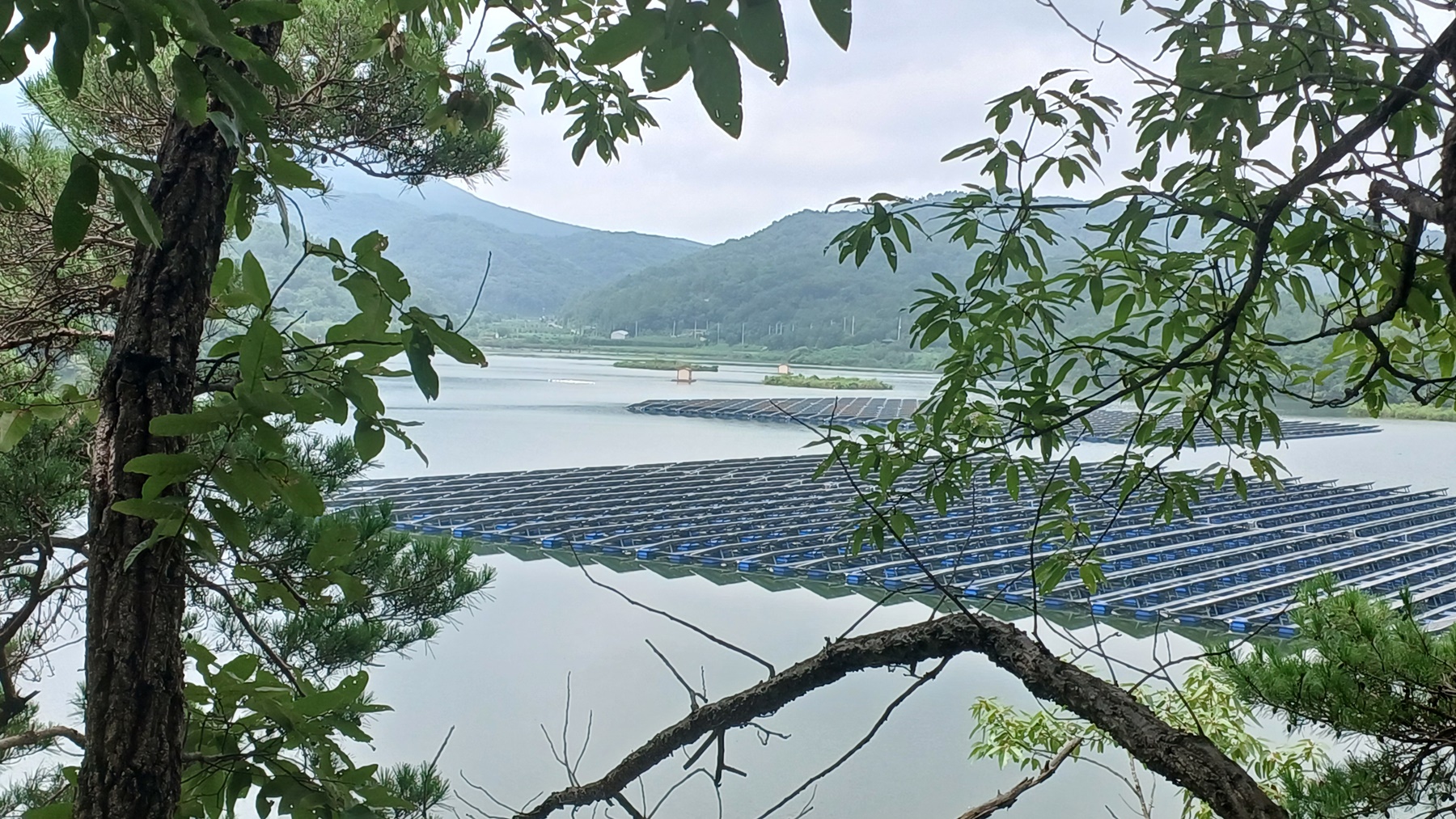 조성지 내의 부유식 산란장과 양식장 건너편 장국리 마을의 이현재가 보이고,