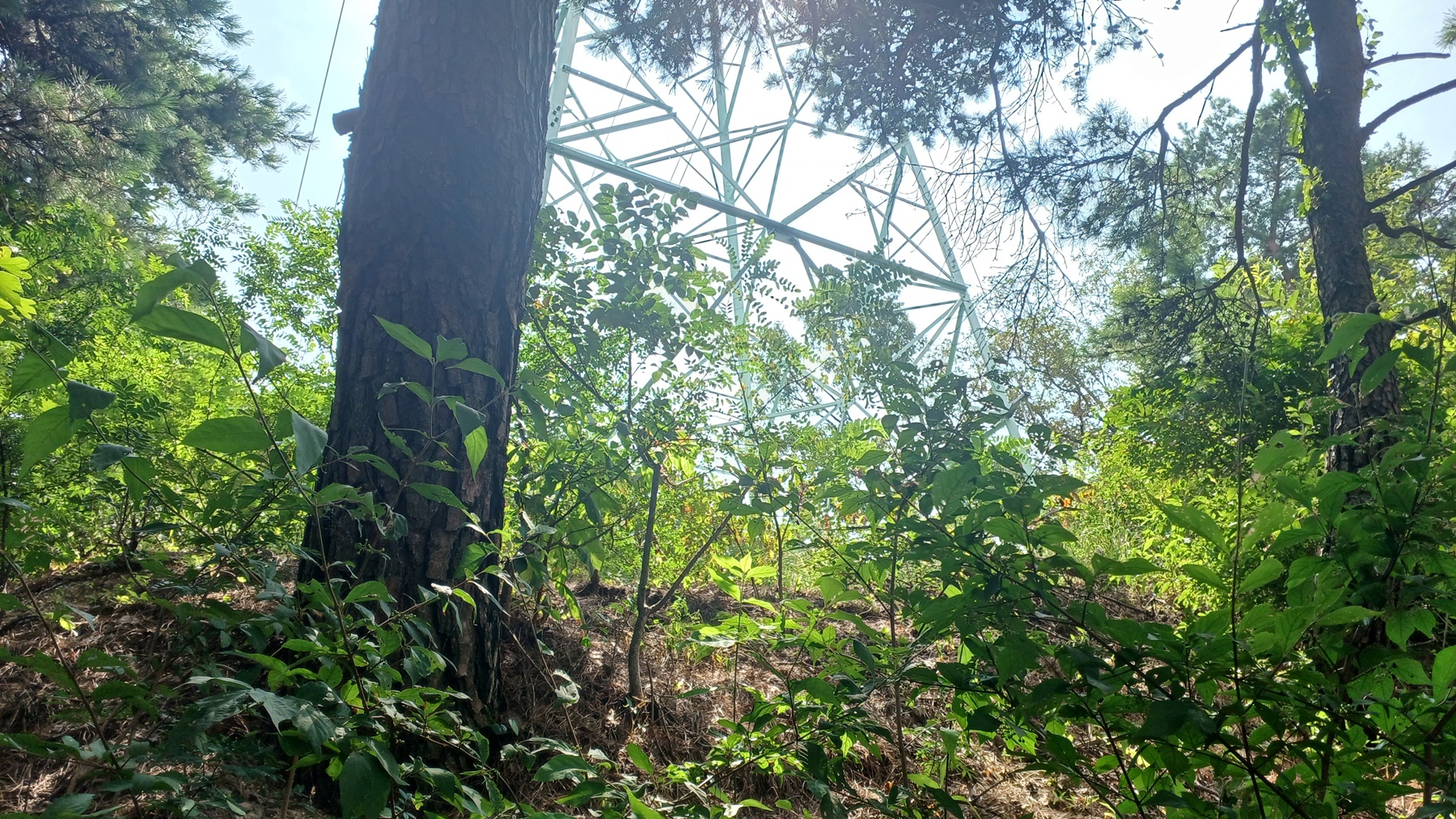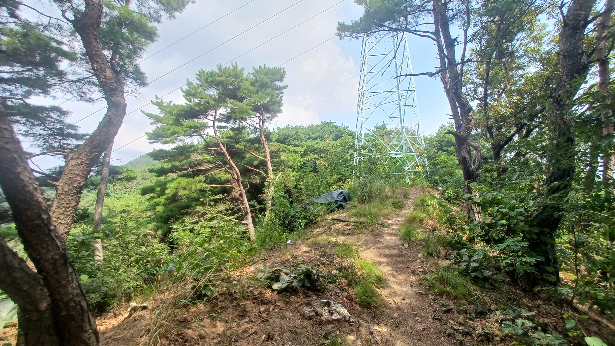 큰 바위 뒷편으로 철탑이 보이는 철탑 아래 산사면길을 지나