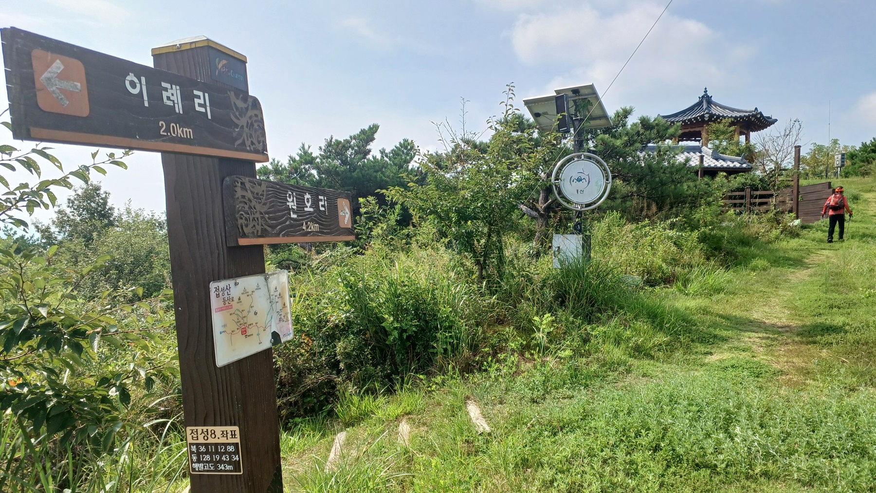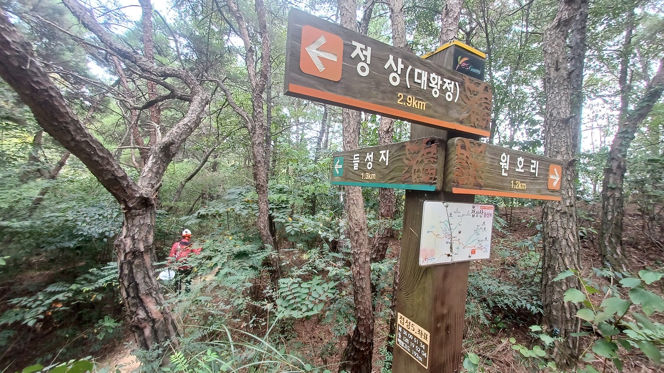 해발 193m의 원호리(1.2km)와 들성지(1.3km)로 가는 이정표 갈림길에서