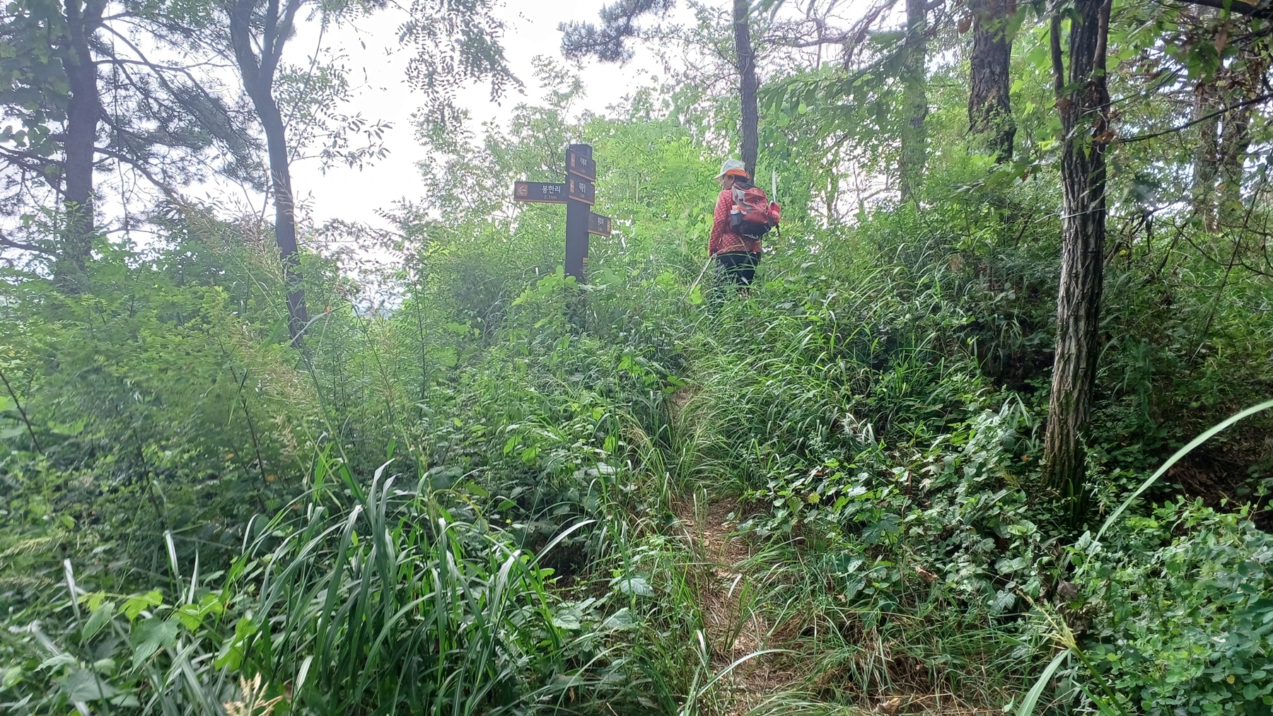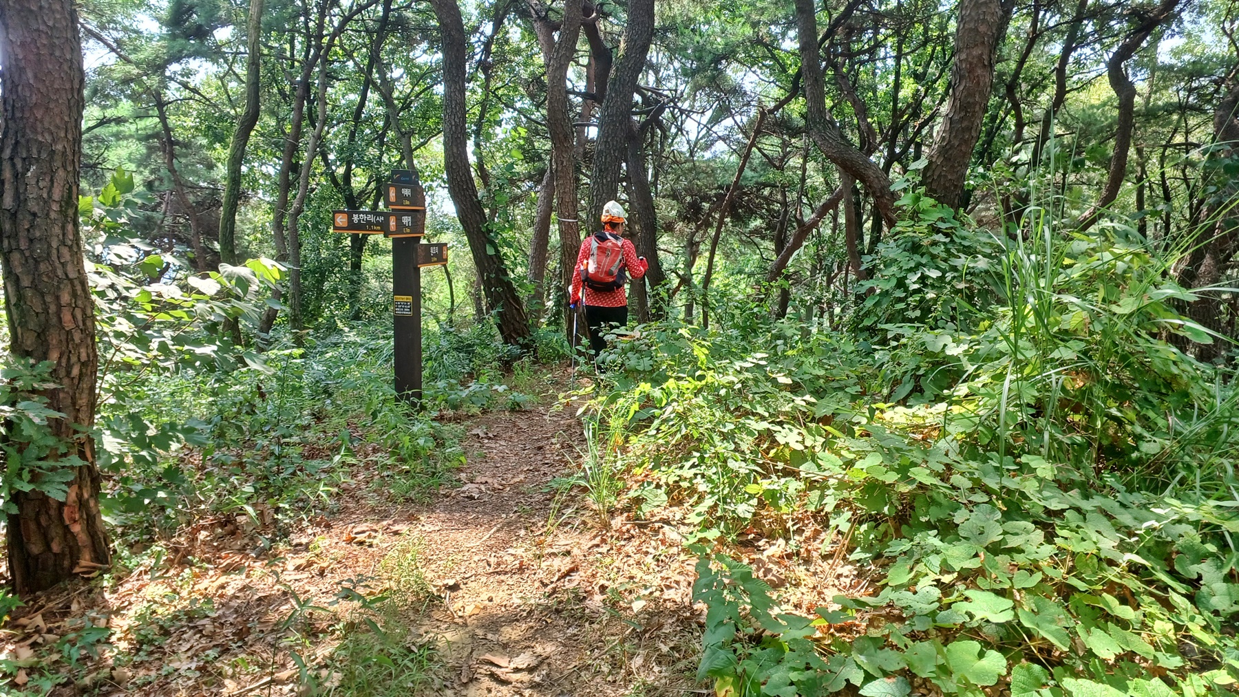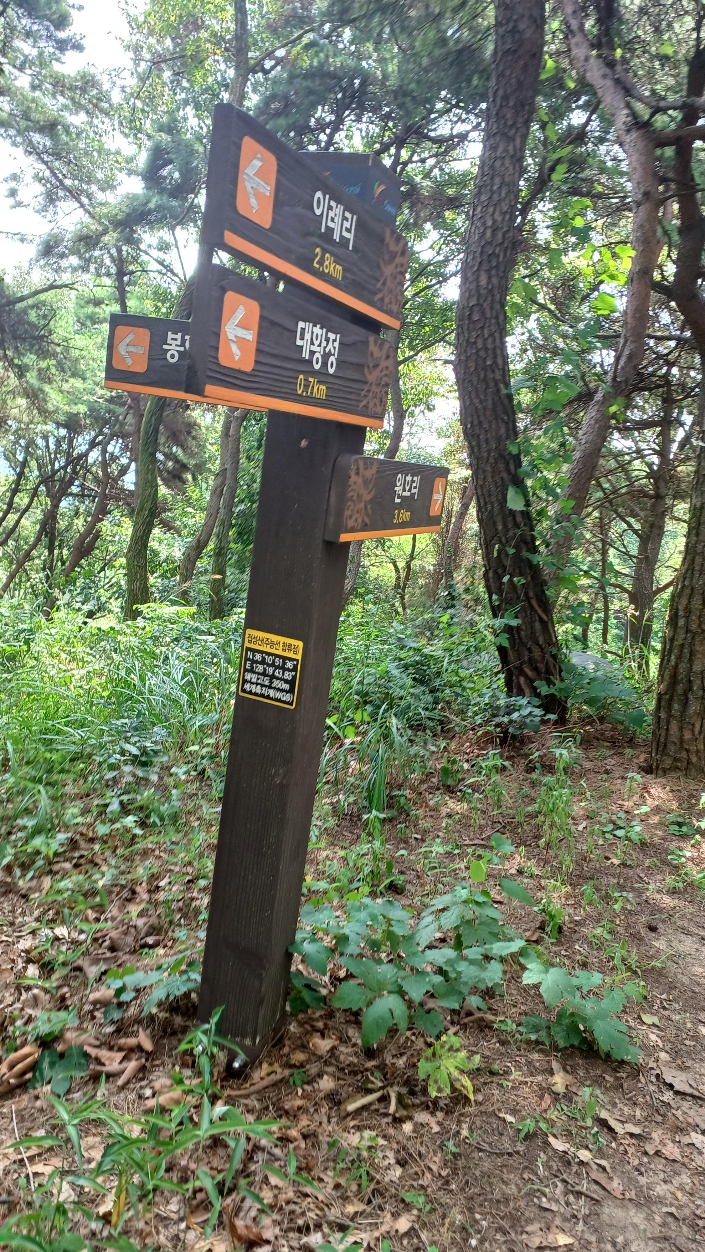 해발 350m의 봉한리 갈림길 이정표(이례리2.8km-대황정0.7km-원호리 3.6km)에서