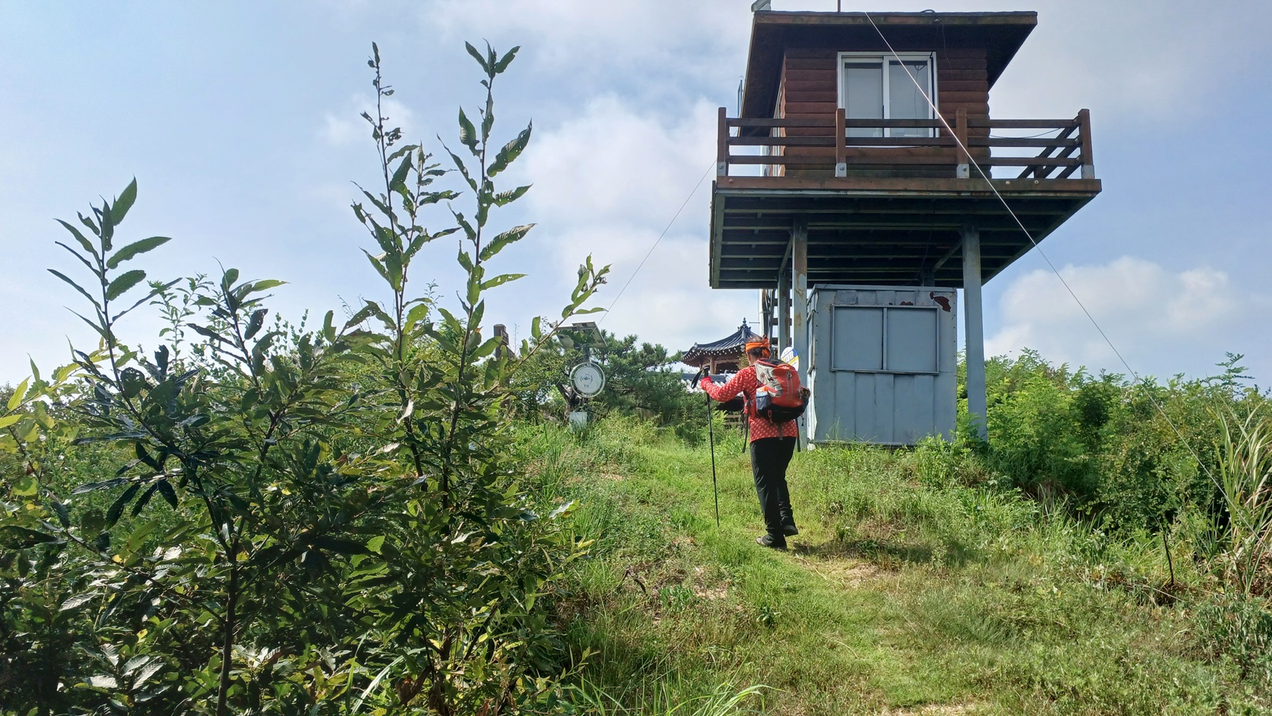 운동기구와 벤치가 있는 능선에 올라