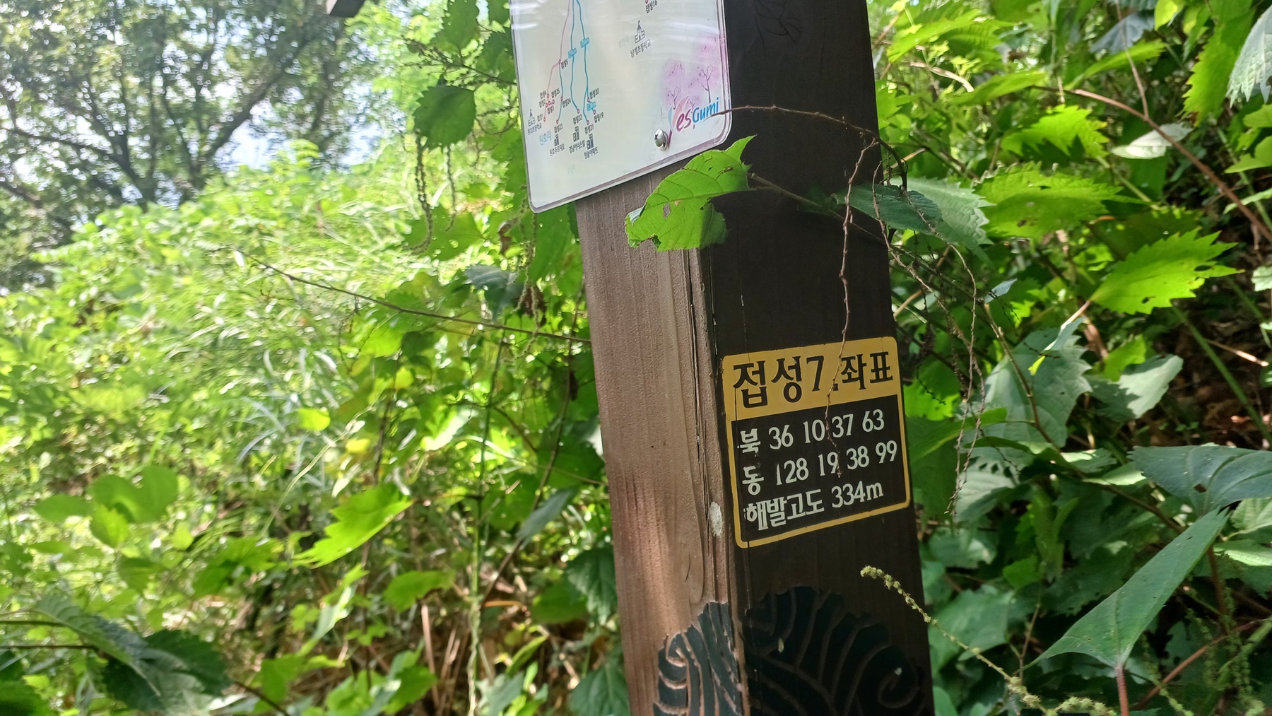 해발 334m봉의 이정표에 오른다.