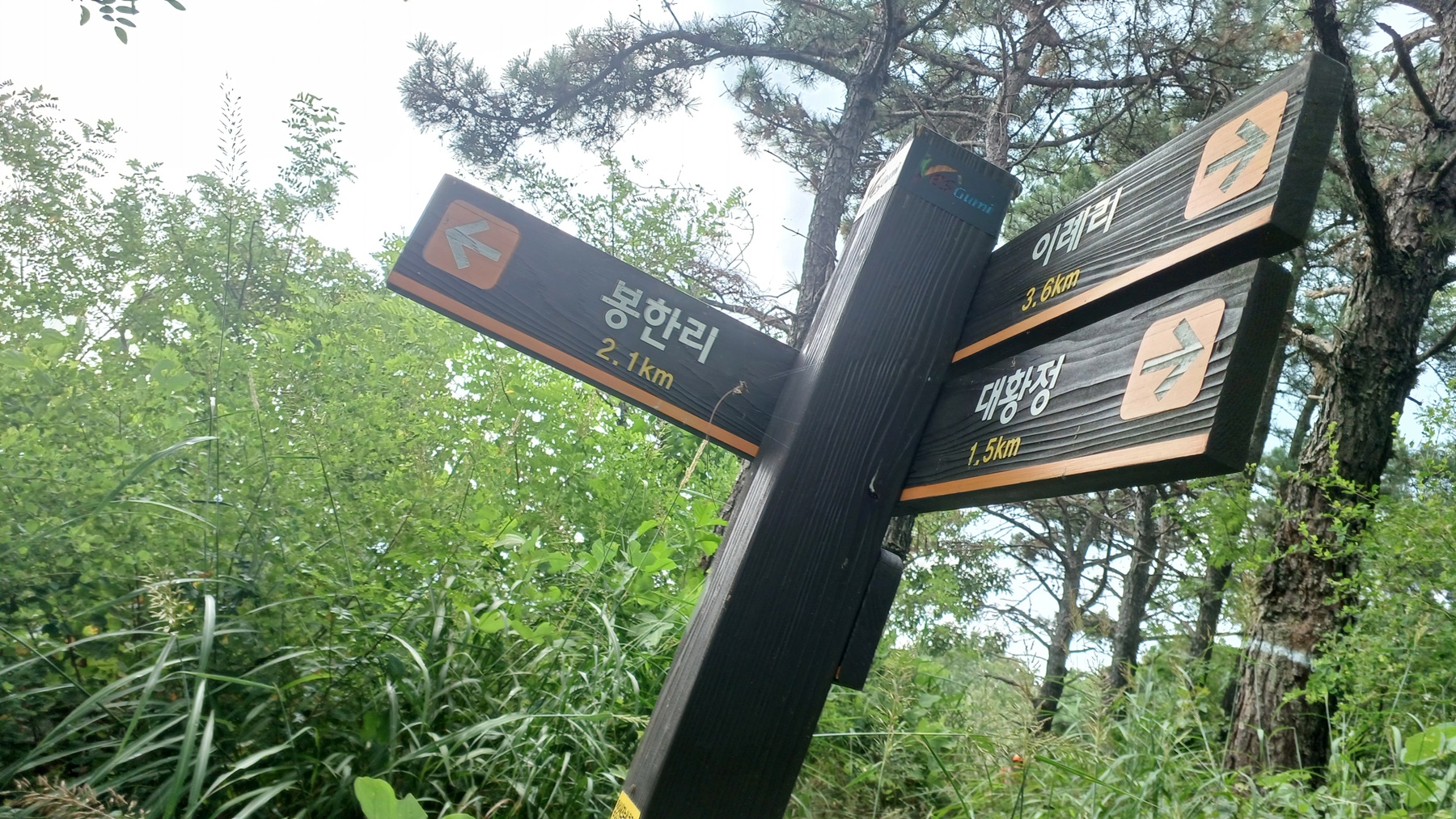 해발 382m의 헬기장 앞 이정표(이례리 2.3km-대황정 0.2km-원호리 4.0km)에 도착한다.