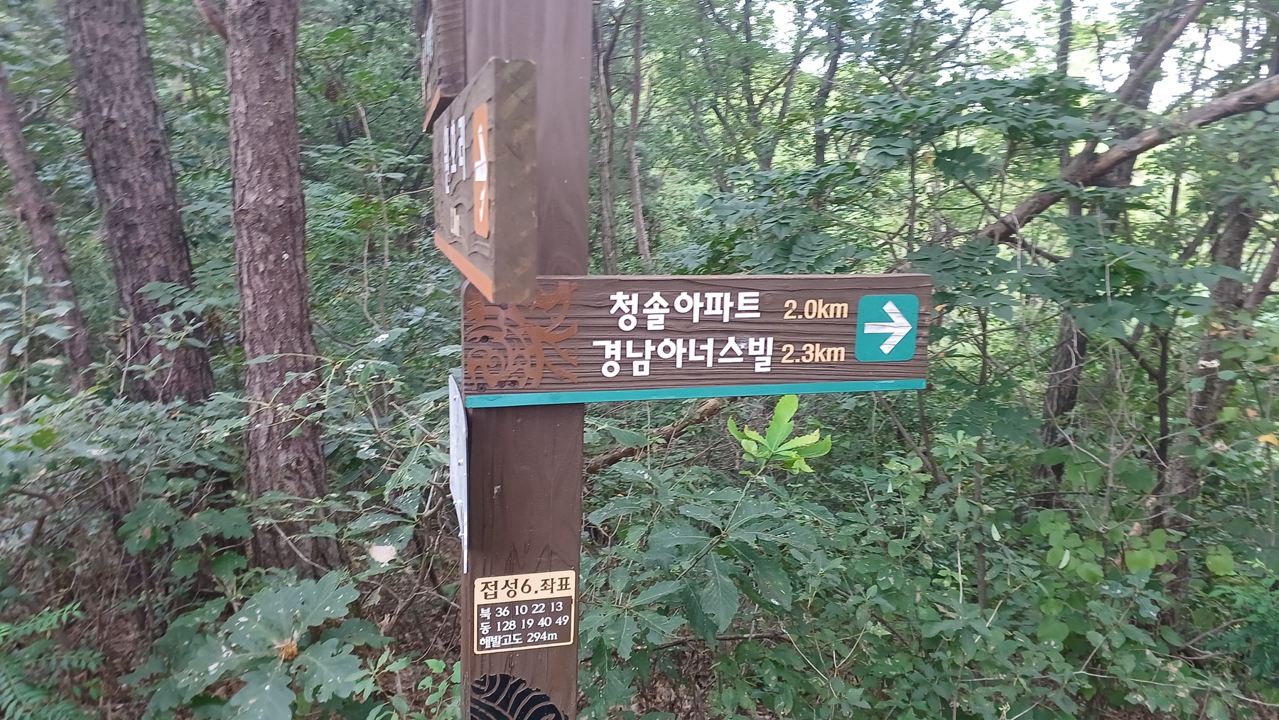 해발 294m의 청솔 아파트 갈림길 이정표(정상1.8km-청솔아파트2.0km/경남 아너스빌2.3km-원호리2.3km)를 만난다.