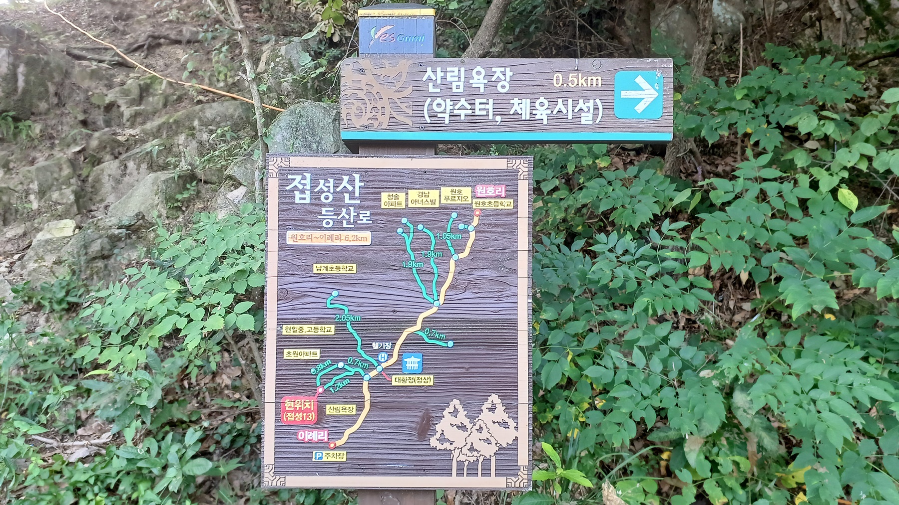 산림욕장/약수터/체육 시설(0.5km) 방향으로 하여 이 곳으로 오르는 등산로다.