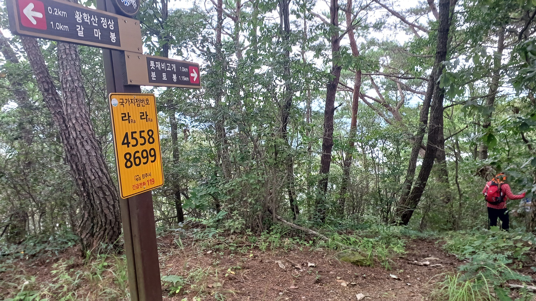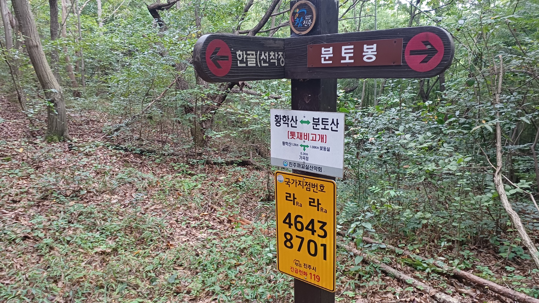 이정표(주차장0.9km-한골 1.55km)에는 없으나 이정표 아래 표시판에서 황학산 방향으로
