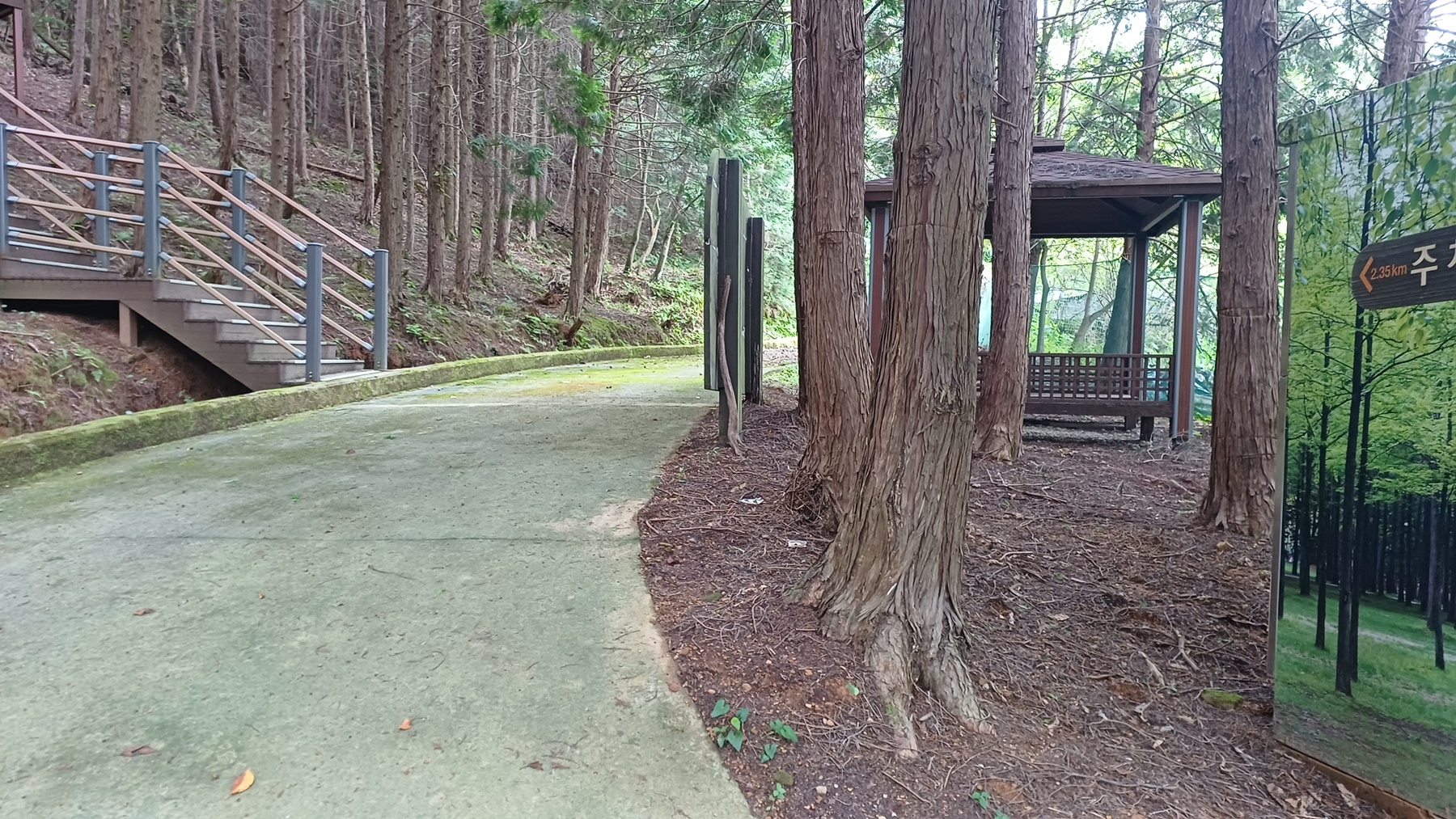 좌측 데크계단길로 편백 나무숲으로 오르는 데크 계단길과 우측으로 정자 쉼터가 나온다.