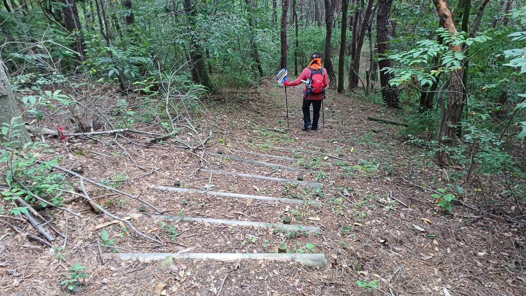 급경사 내리막 통나무 계단을 내려서면