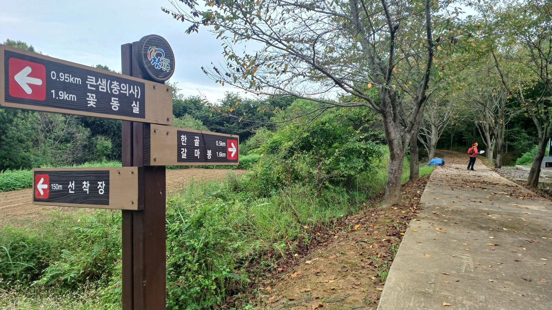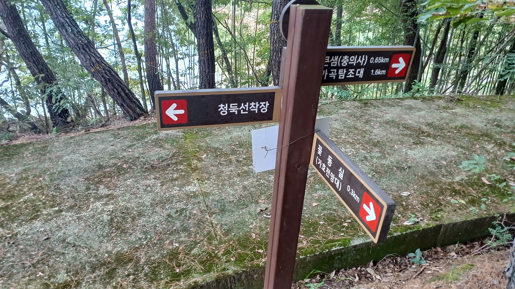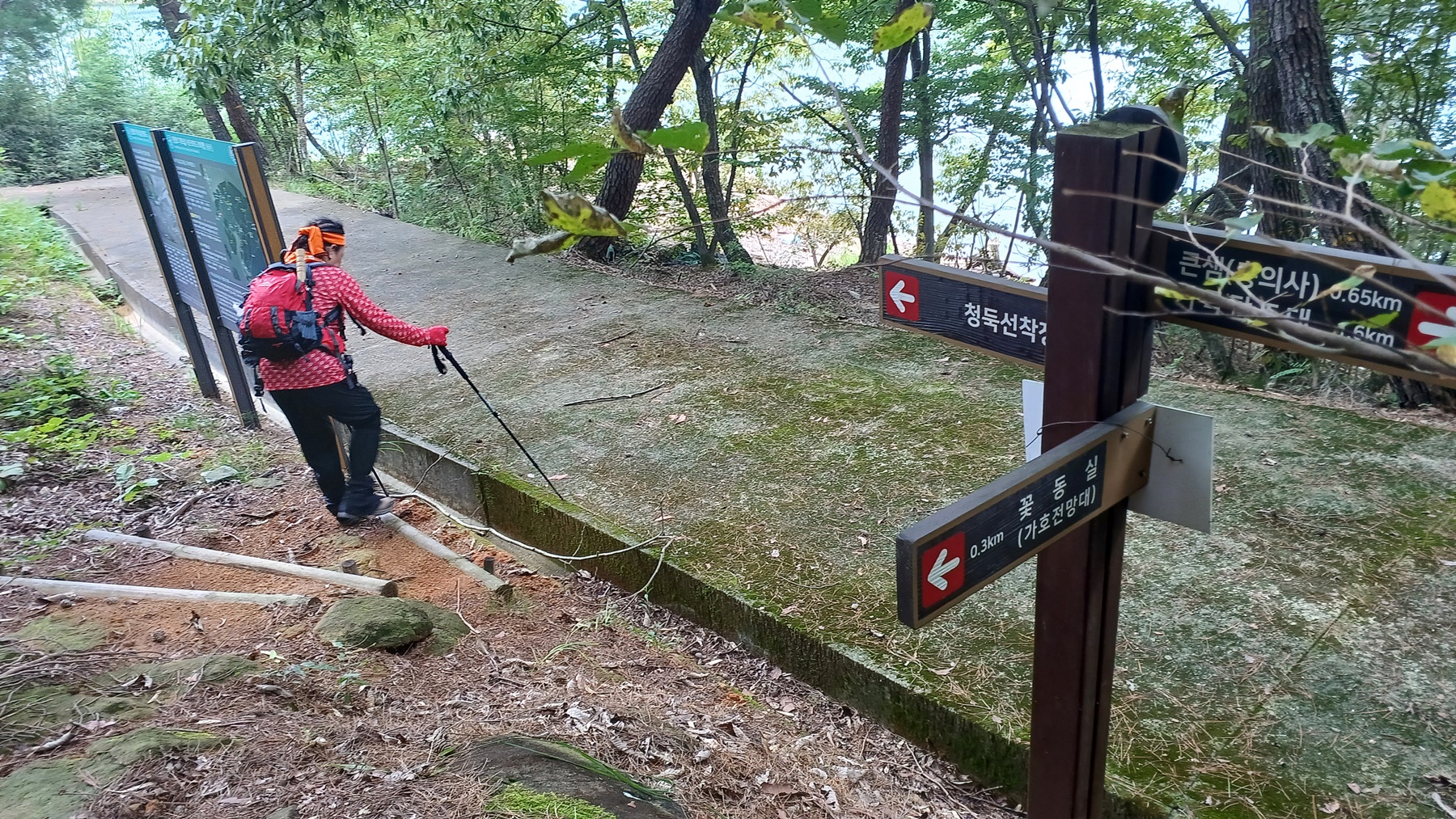 선착장 갈림길 이정표(꽃동실1.95km,큰샘/충의사0.95km-선착장 150m-한골0.5km/갈마봉 1.6km)를 지나면
