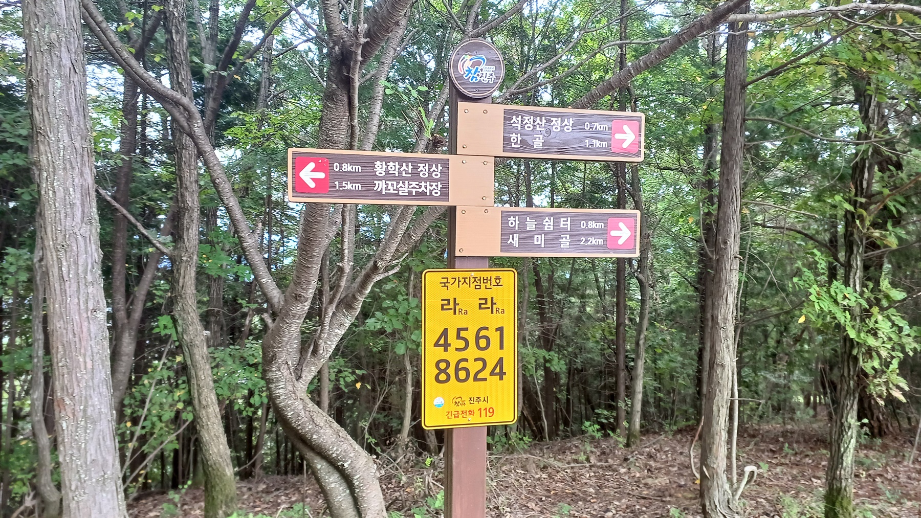 갈마봉 이정표(황학산 정상0.8km/까꼬실 주차장1.5km-석정산 정상0.7km/한골1.1km-하늘쉼터 0.8km/새미골2.2km).