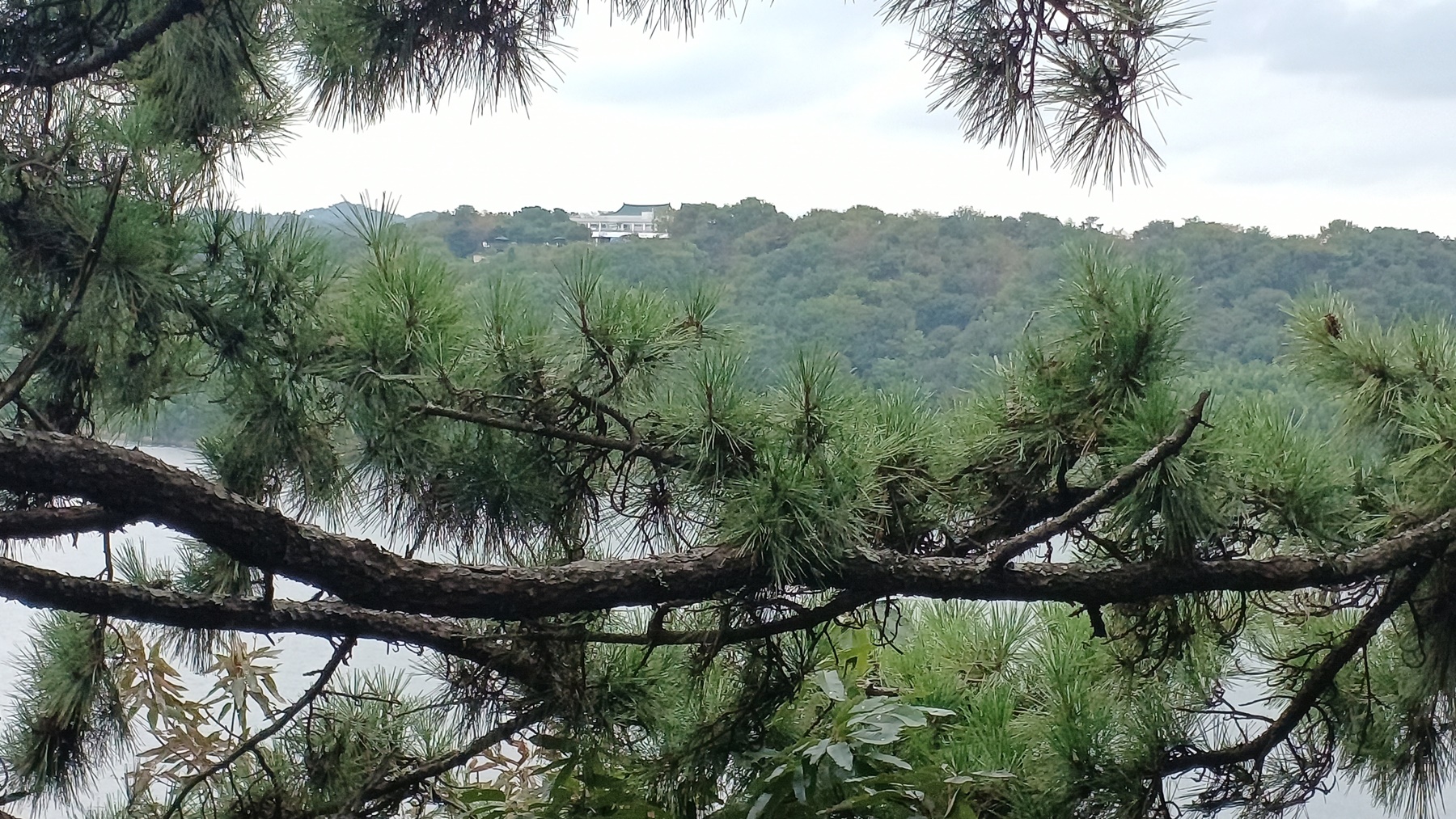진양호 건너편으로 진양호 공원 내 진양호 전망대와 흰건물인 '아시아 레이크 사이드 호텔 웨딩 컨벤션'가 조망되고