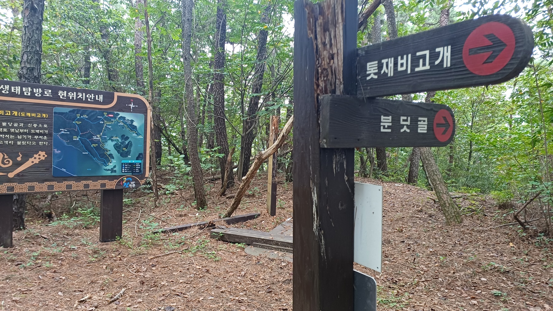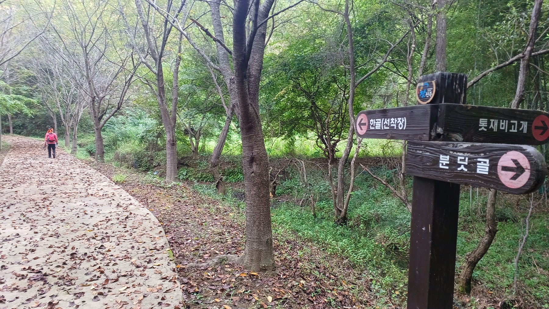 우측 톳제비 고개에서 오는 삼거리 갈림길 이정표(분딧골-톳재비고개-한골/선착장)를 지나