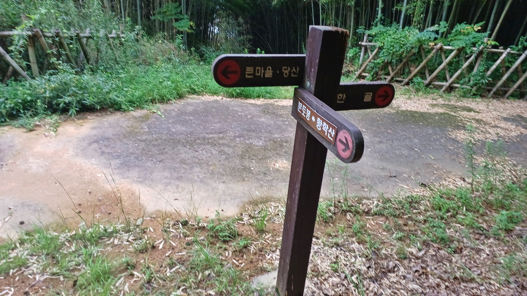 한골 삼거리 갈림길 이정표(꽃동실2.3km-새미골1.8km-주차장2.35km)에서