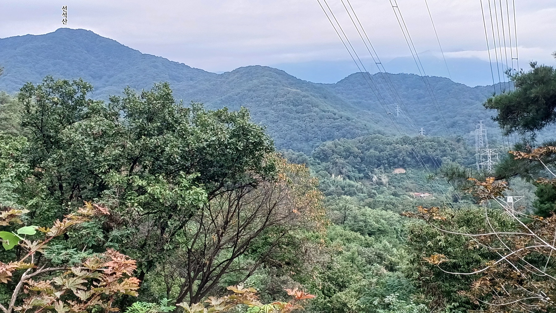 좌측으로 465봉-능선 갈림길 이정표 지점-철탑봉인 394봉-박집산 봉수대터가 보인다.