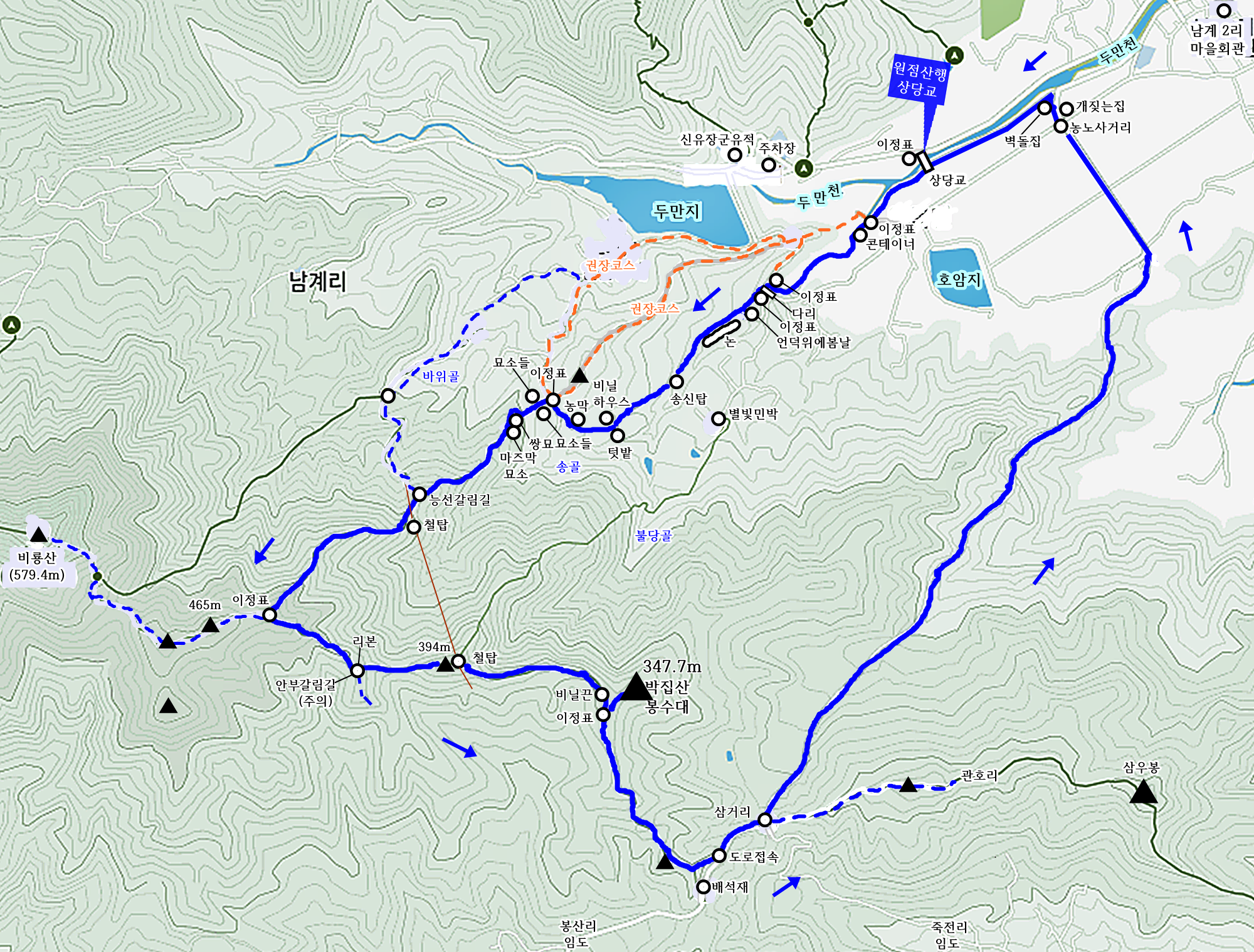 -언덕 위에 봄날(식당)-임도(논 위)-산비탈길-송골 방향-송신탑-계곡-텃밭(비닐하우스)-농막-이정표(언덕 사거리)