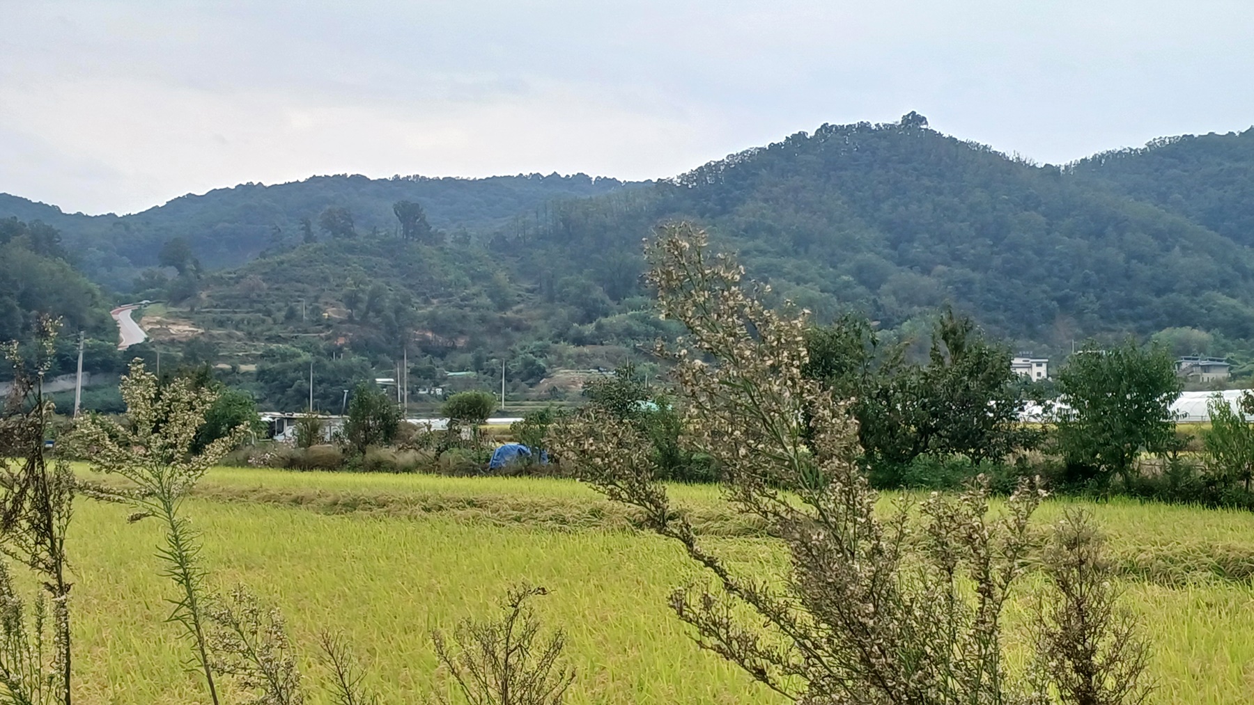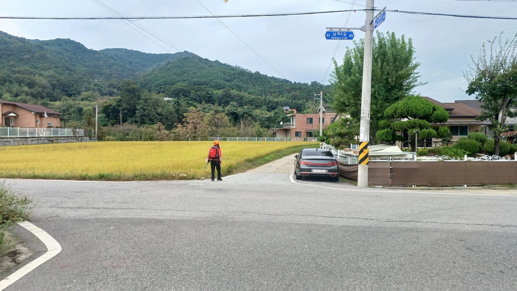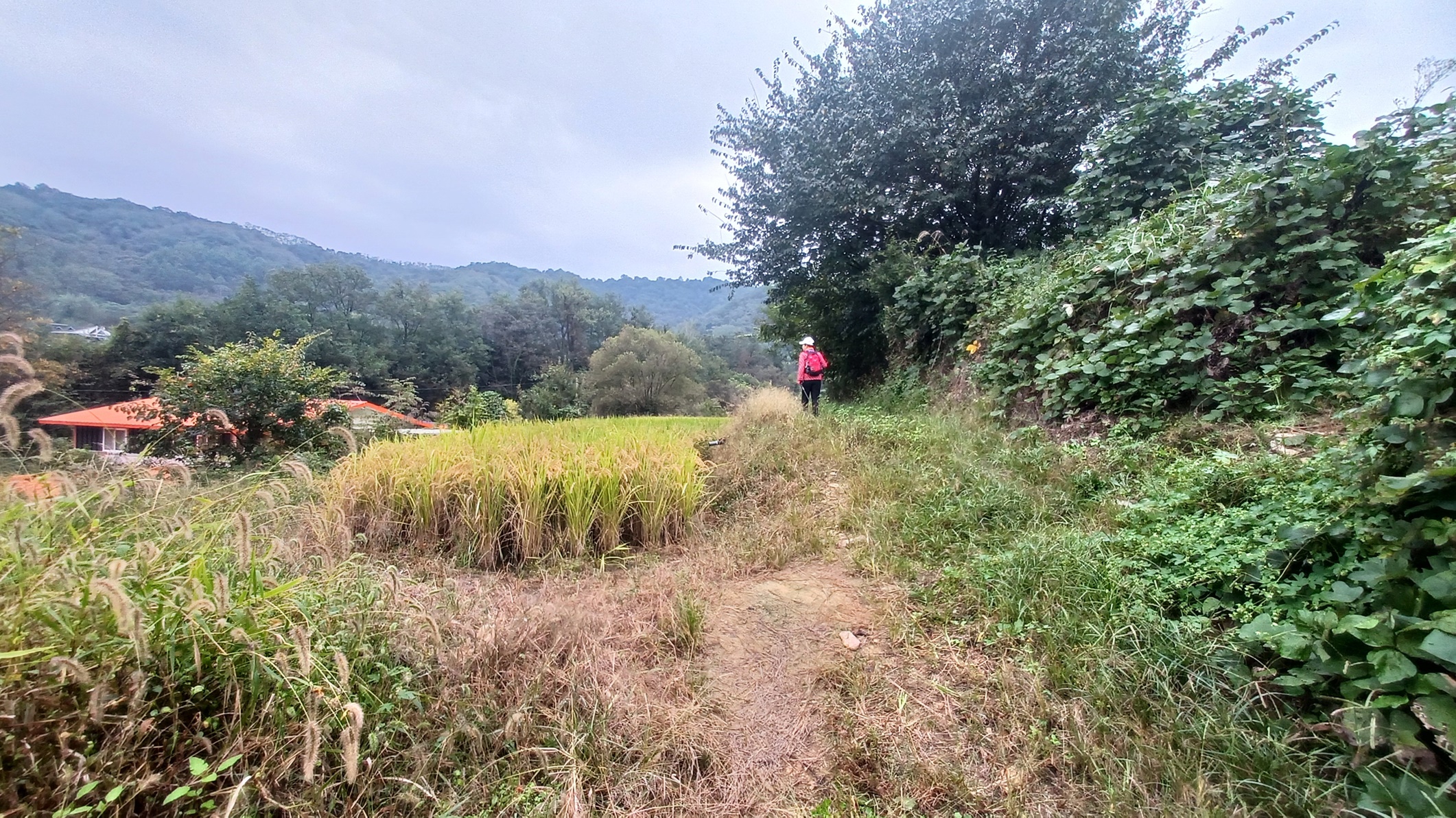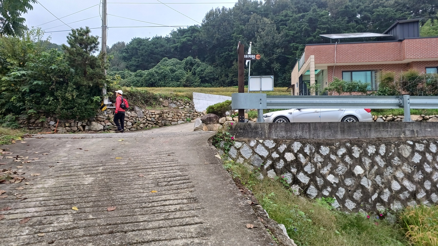 직진하여 벼가 익어가는 논을 지날때 쯤 우측으로 개가 사람을 따라오며 짖어대는 가옥 앞을 지나