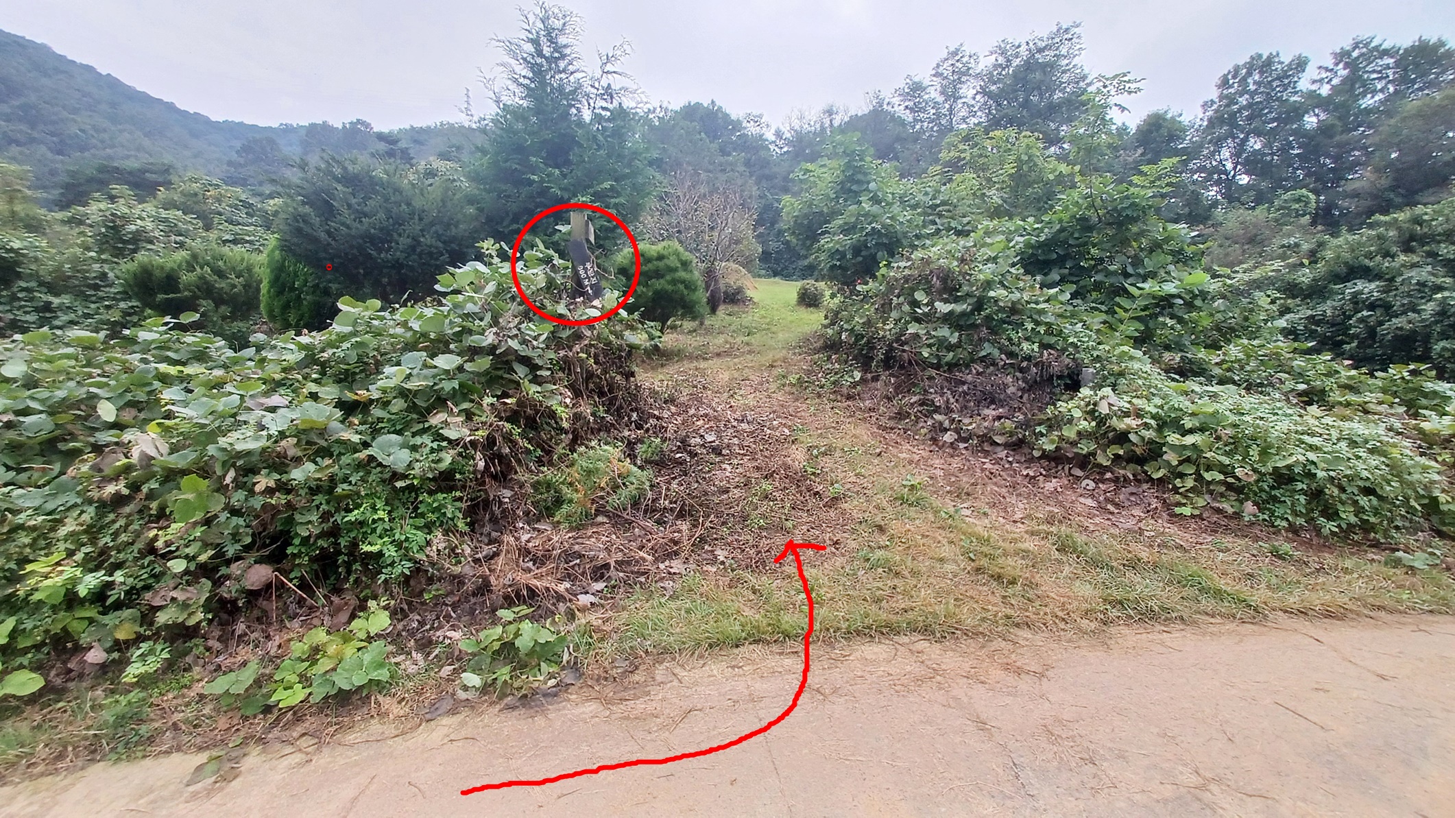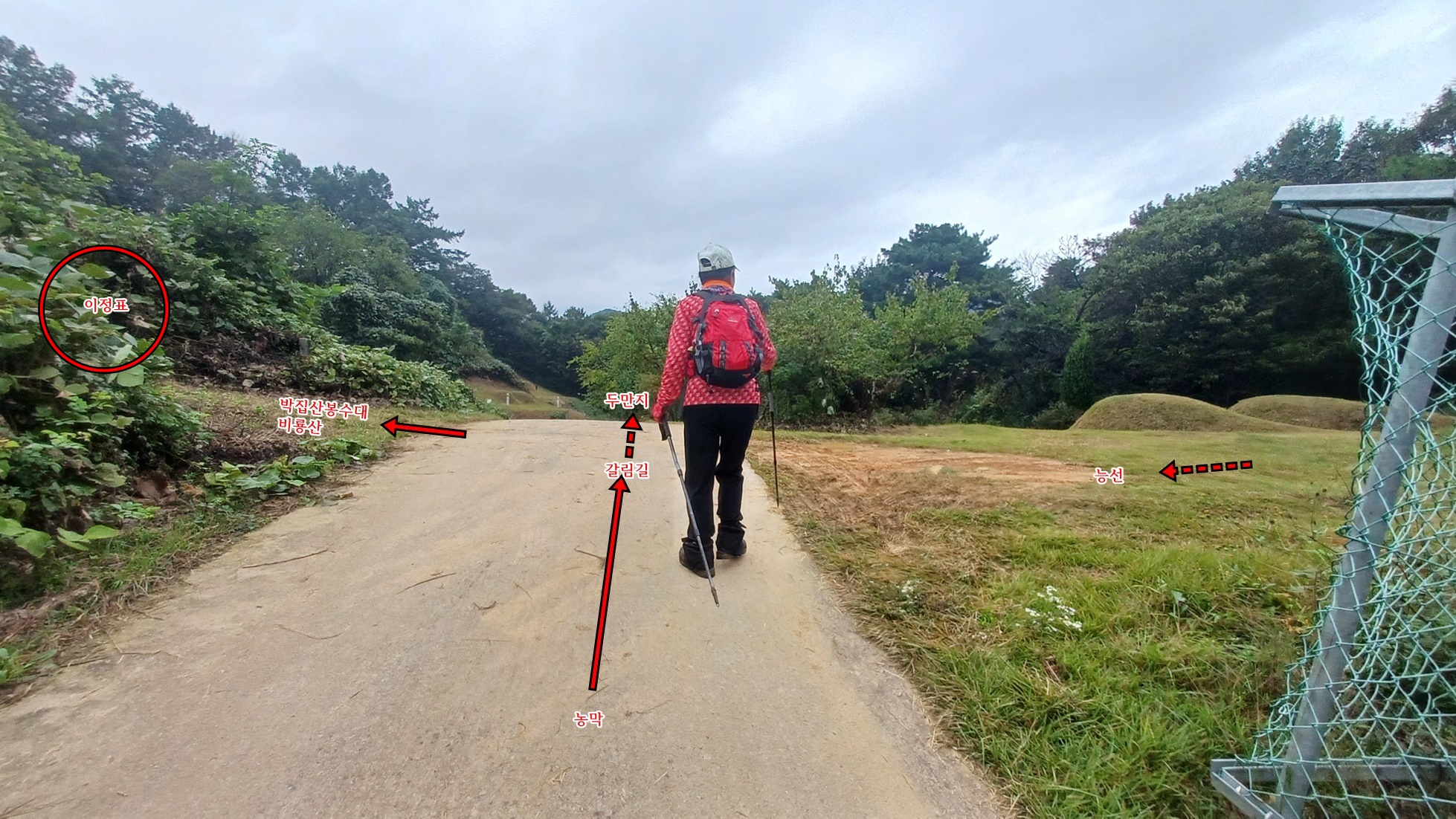 이 지점에서 우측 두만천을 건너는 다리를 건너 논둑에 올라 좌측으로 가서 산길로 들어가