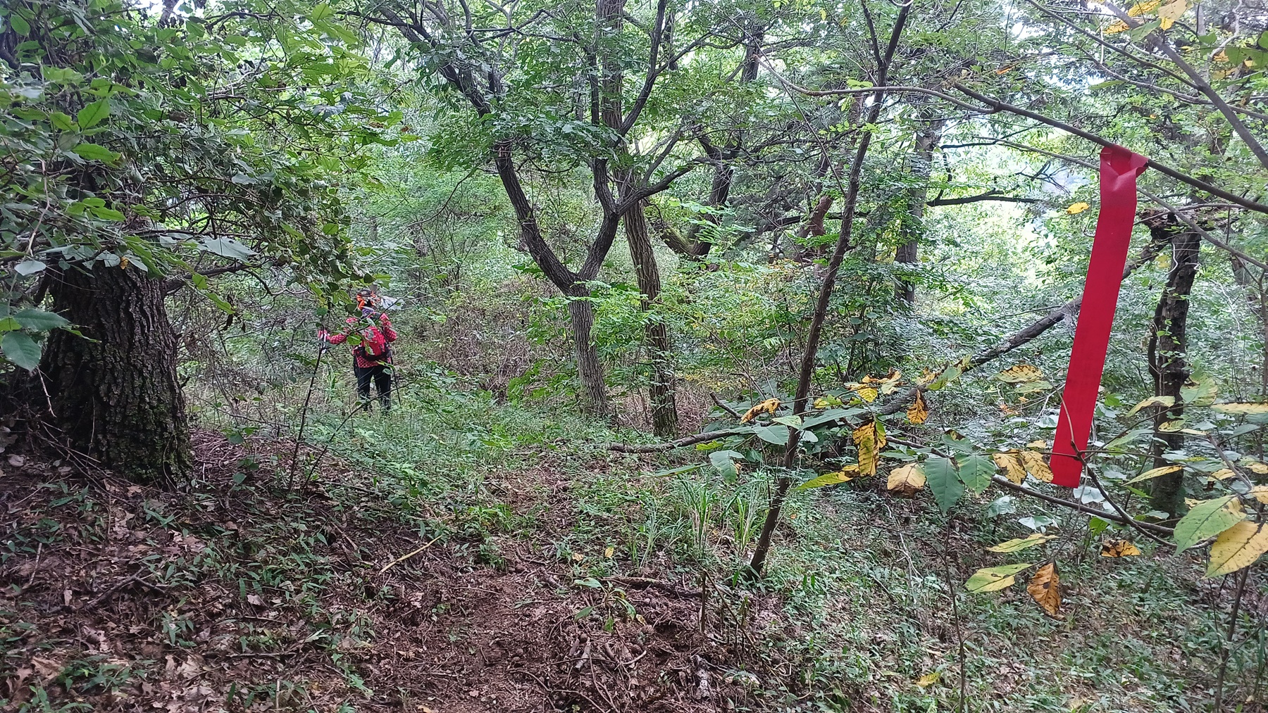 좌측으로 한전 표시기(붉은색)가 줄지어 보이는 산사면길로