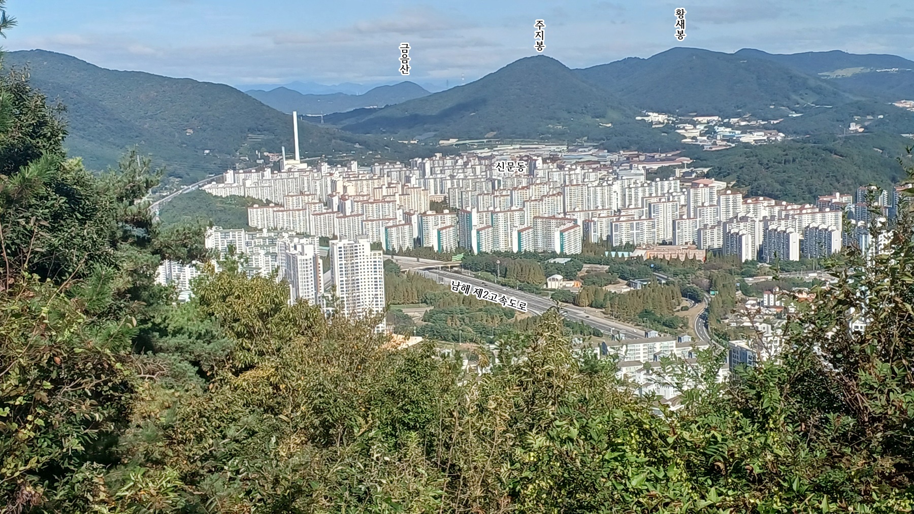 아래 남해 제2고속도로와 신문동의 아파트 군들이 보이고,