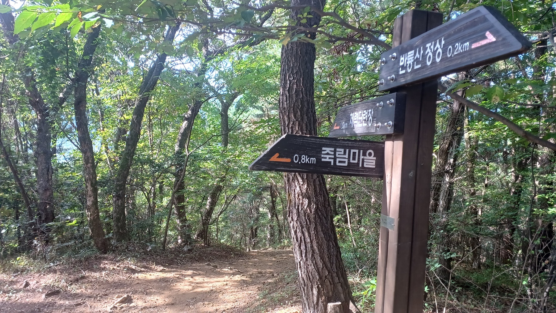 우측은 죽림마을(0.8km)로 가는 내리막길이며,