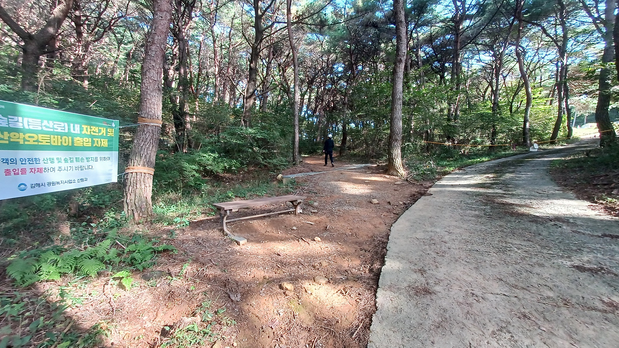 좌측 벤치 방향은 장유 온천 아쿠아웨이브(0.6km)로 가는 길이며,