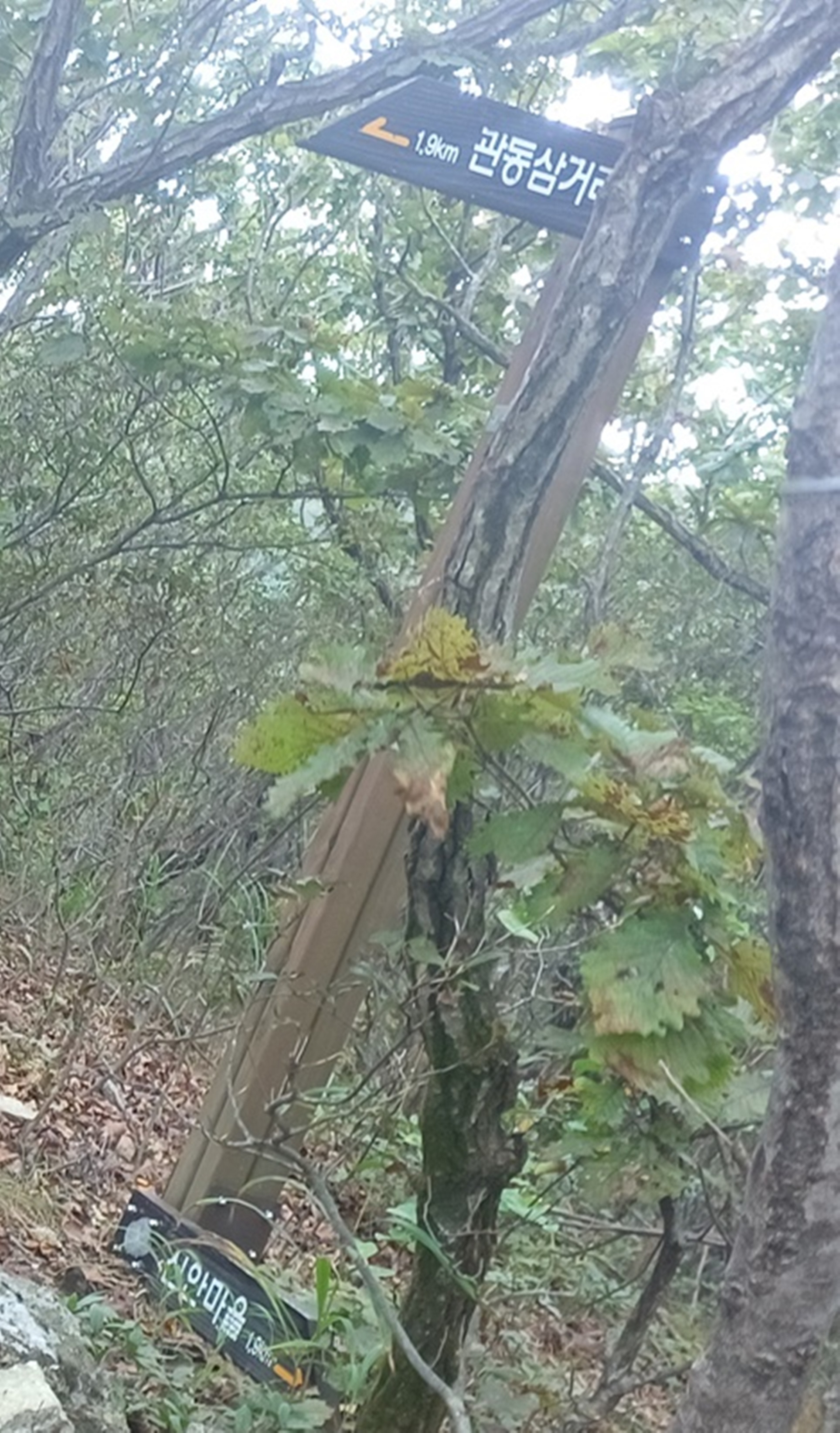 들머리인 이정표에서 약 5분 거리에 위치한 삼거리 갈림길 이정표다.