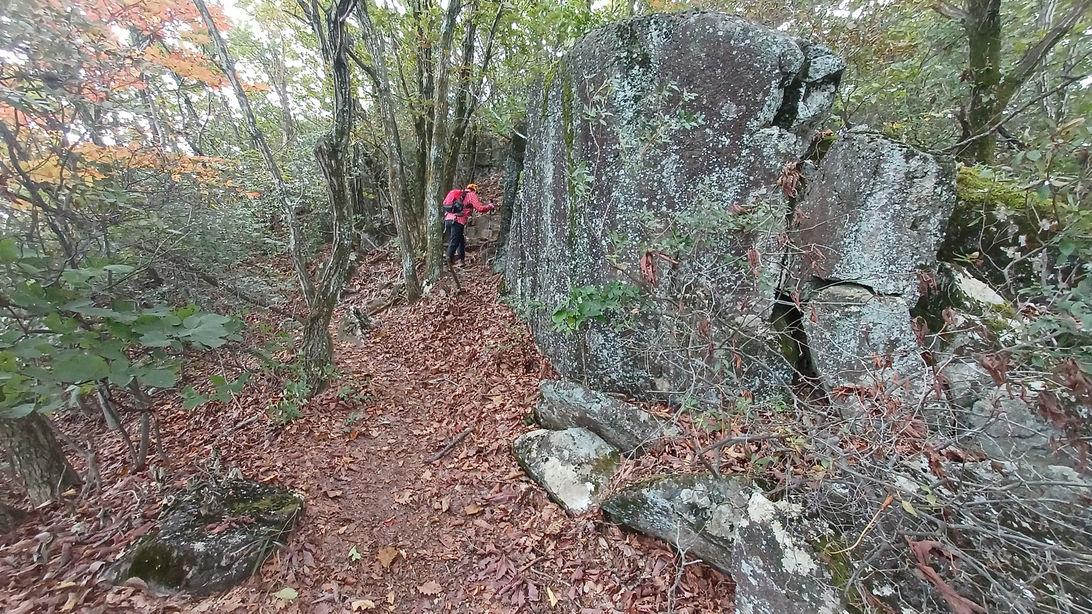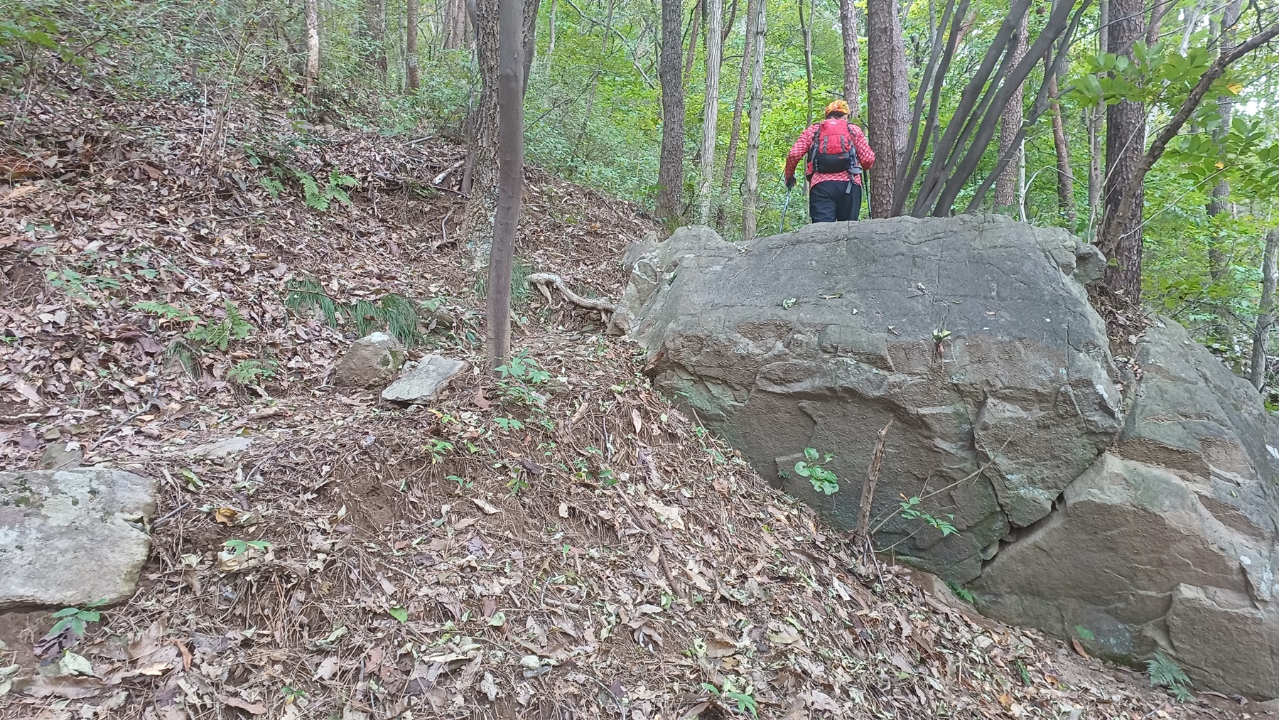 등산로를 가로 막은 바위 능선에는 이번에는 우측으로 우회아여