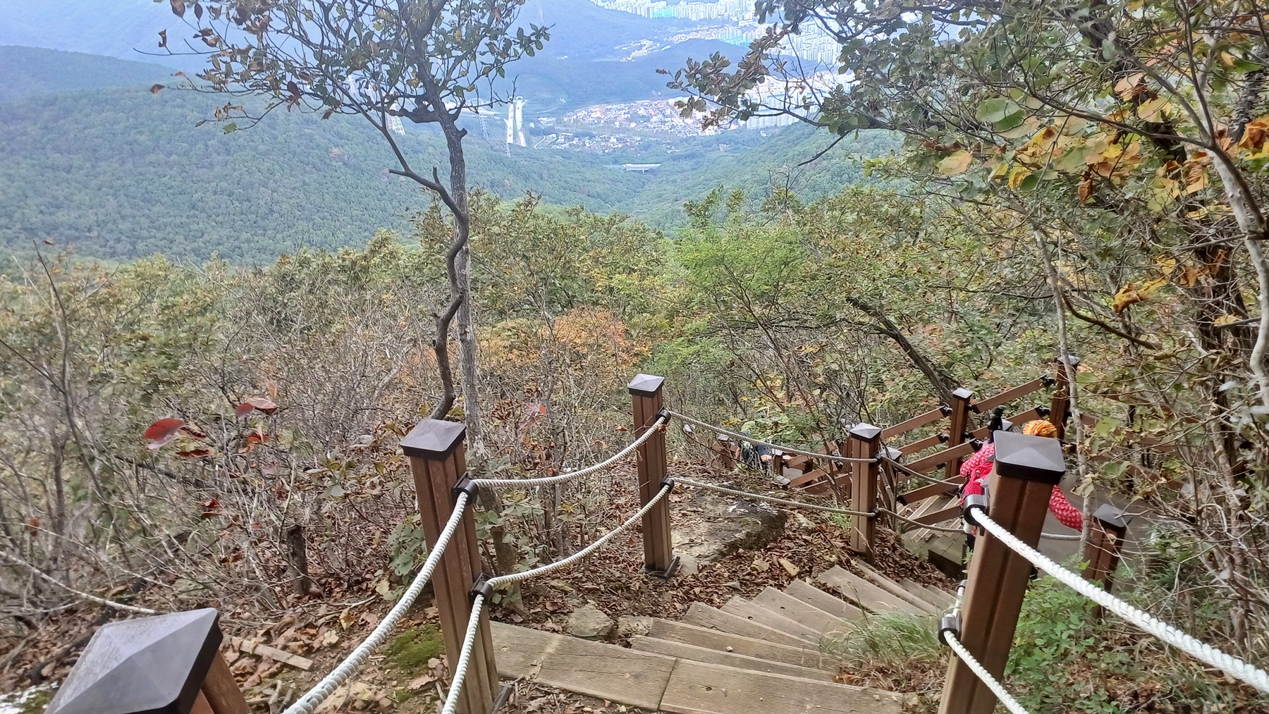 급경사 내리막 데크 계단을 한동안 내려가야 한다.