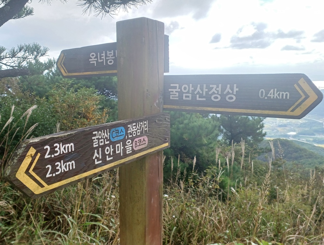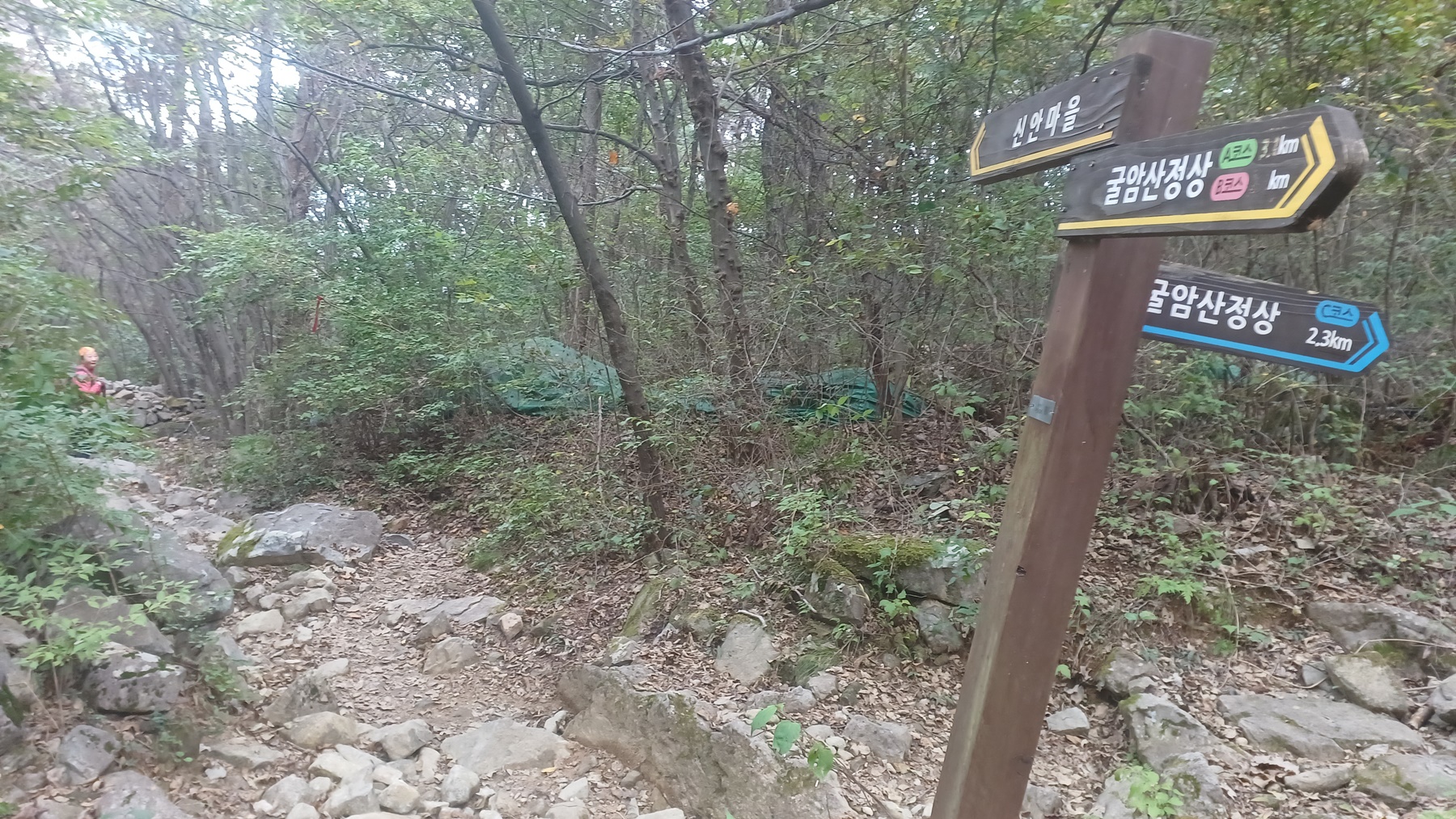 정상 방향으로 현위치 표시목과 이정표( 신안마을2.3km-굴암산0.4km)방향으로 내리막길을 내려가