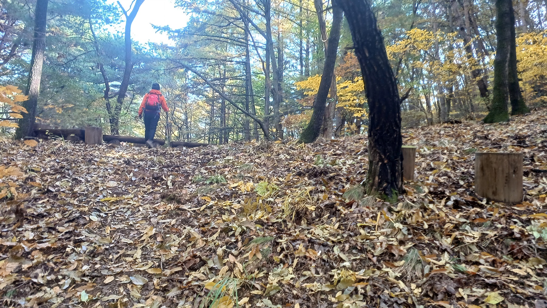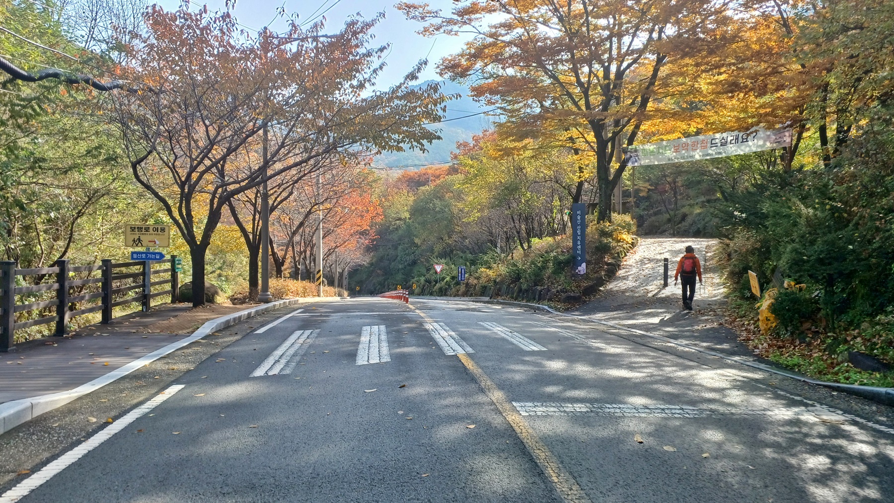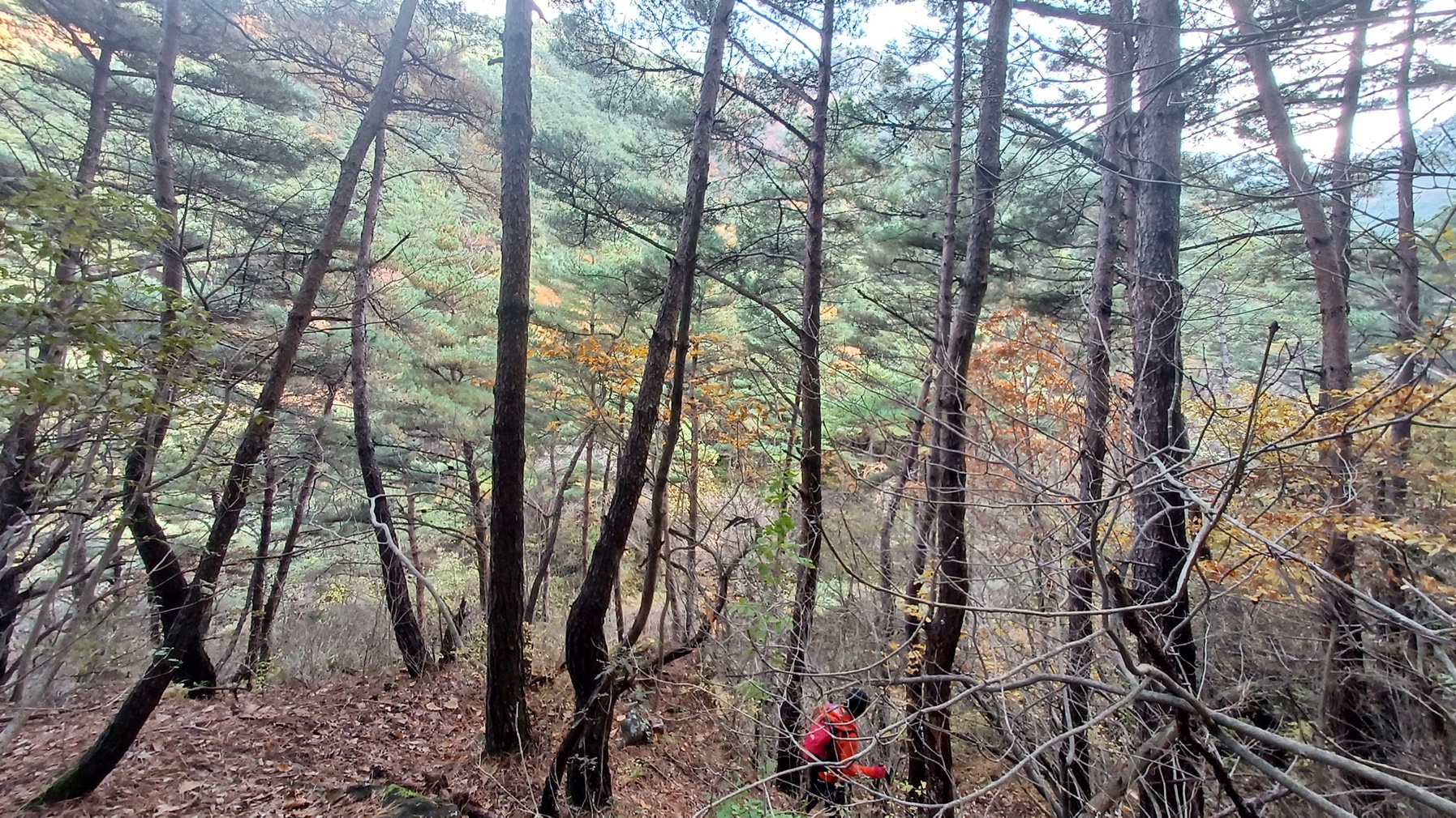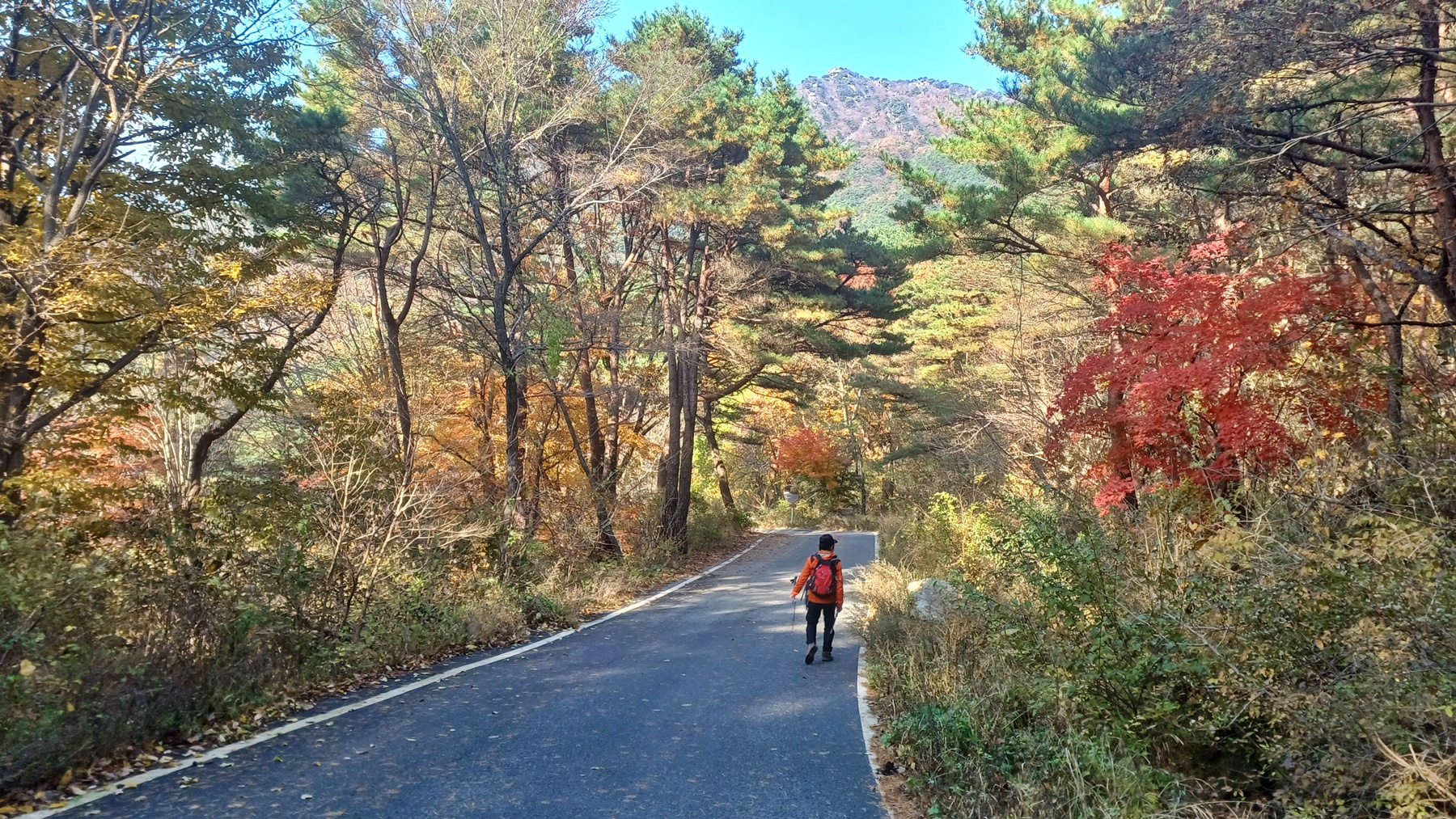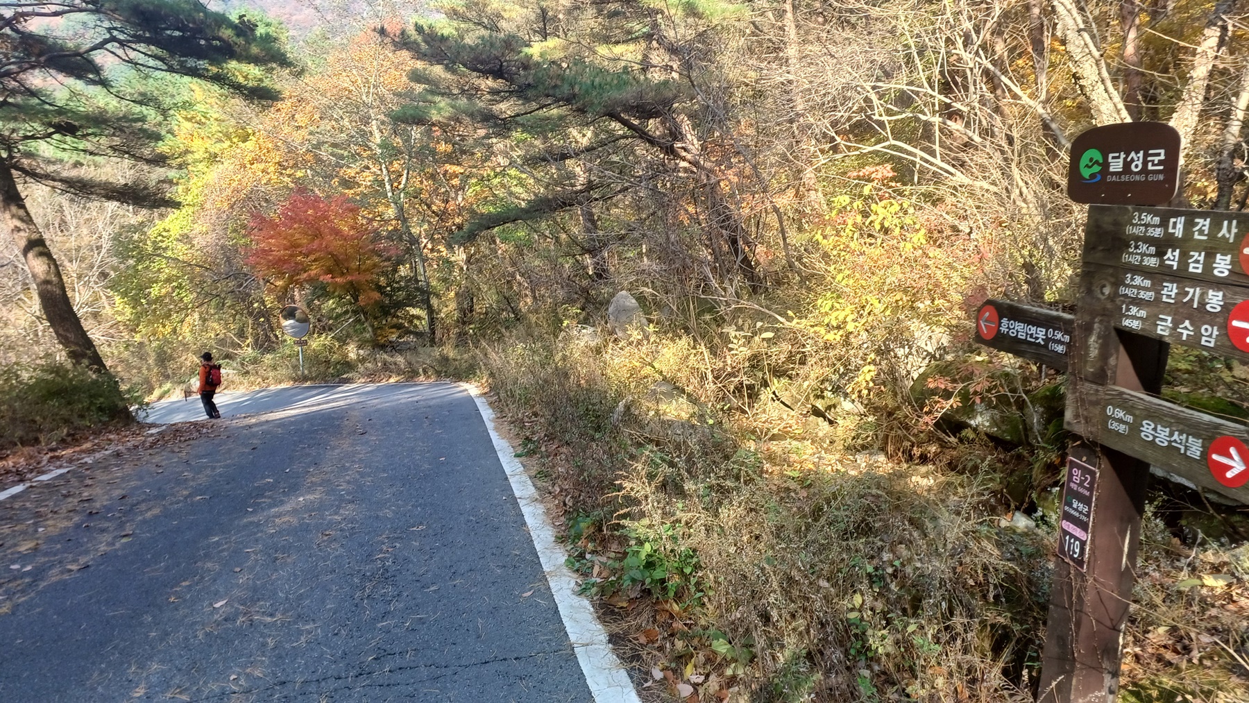 단풍이 붉게 물들은 임도를 따라 내려가면