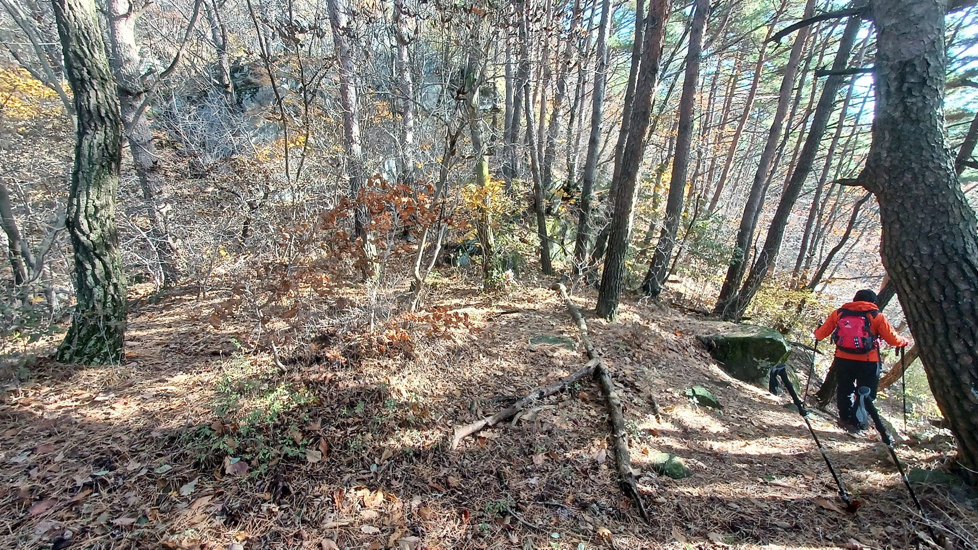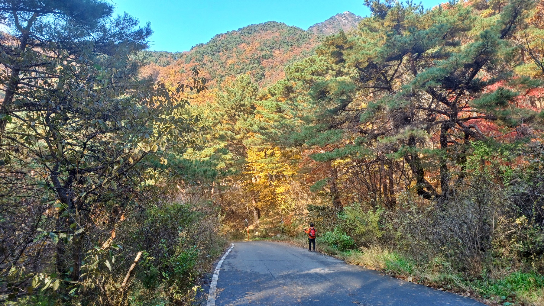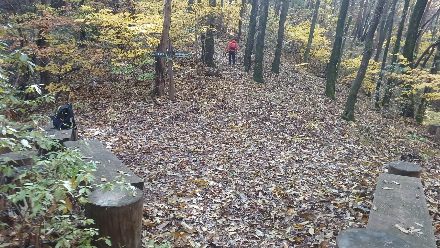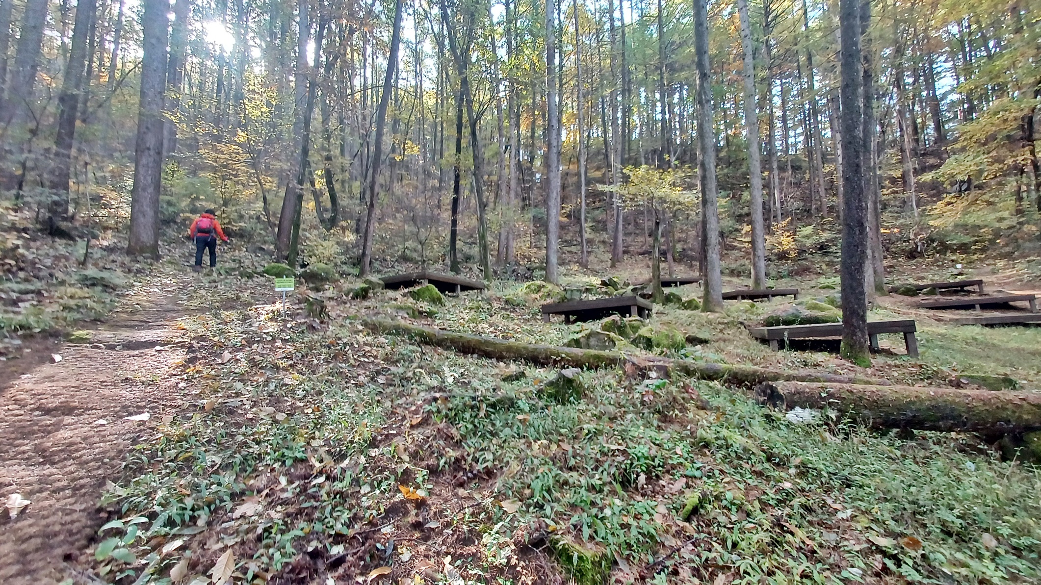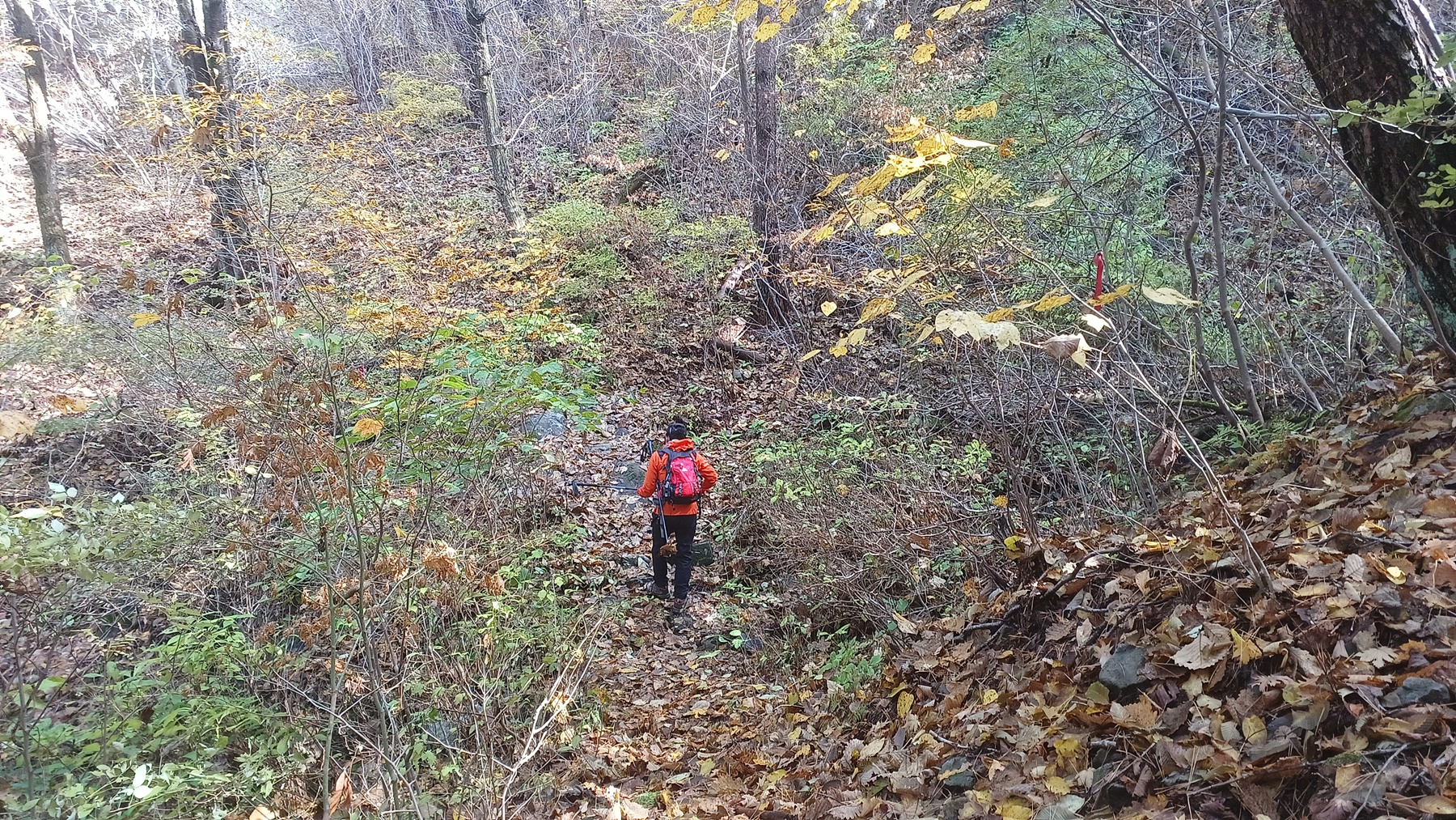 단풍이 붉게 물들은 임도를 따라 내려가면