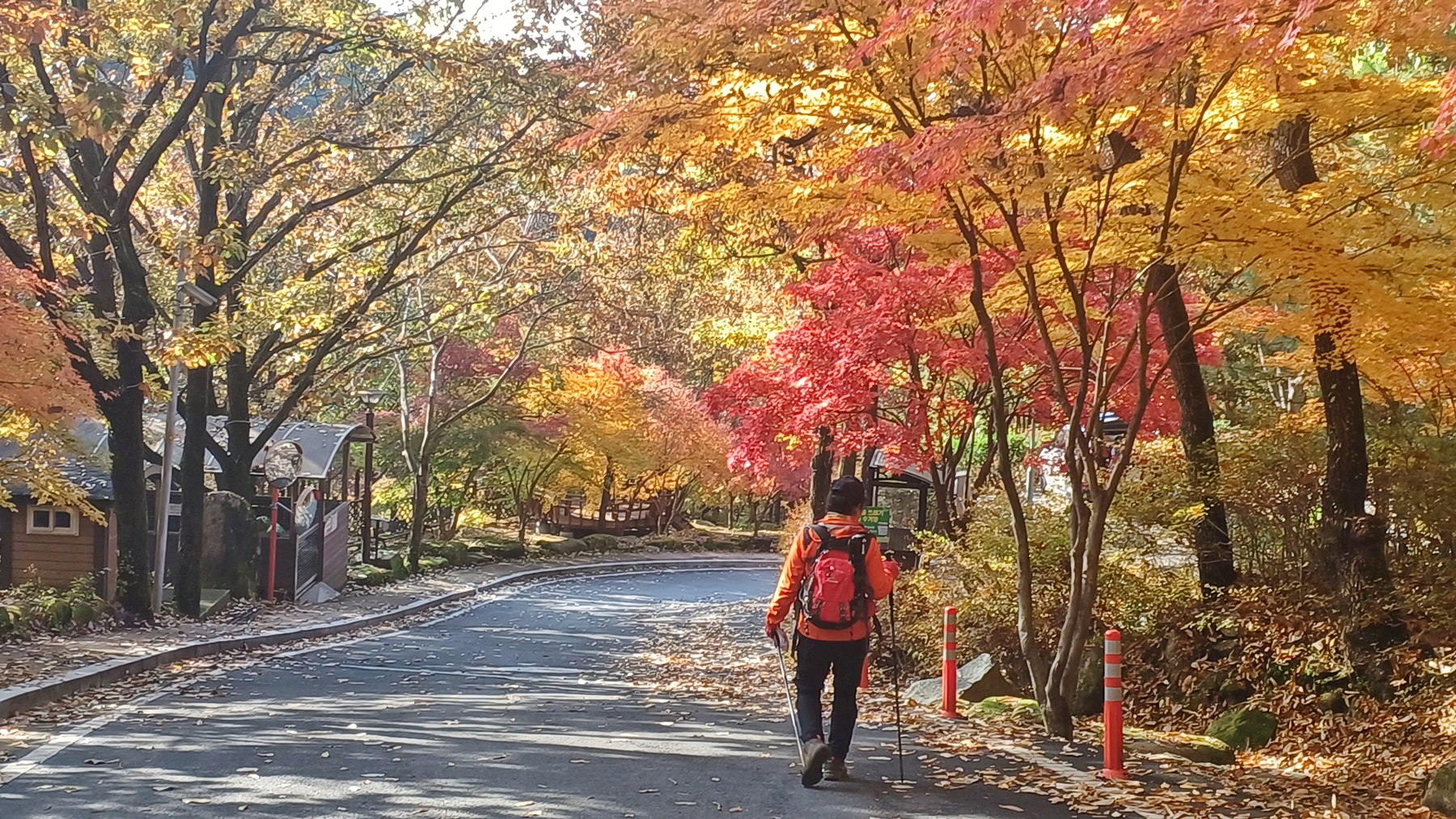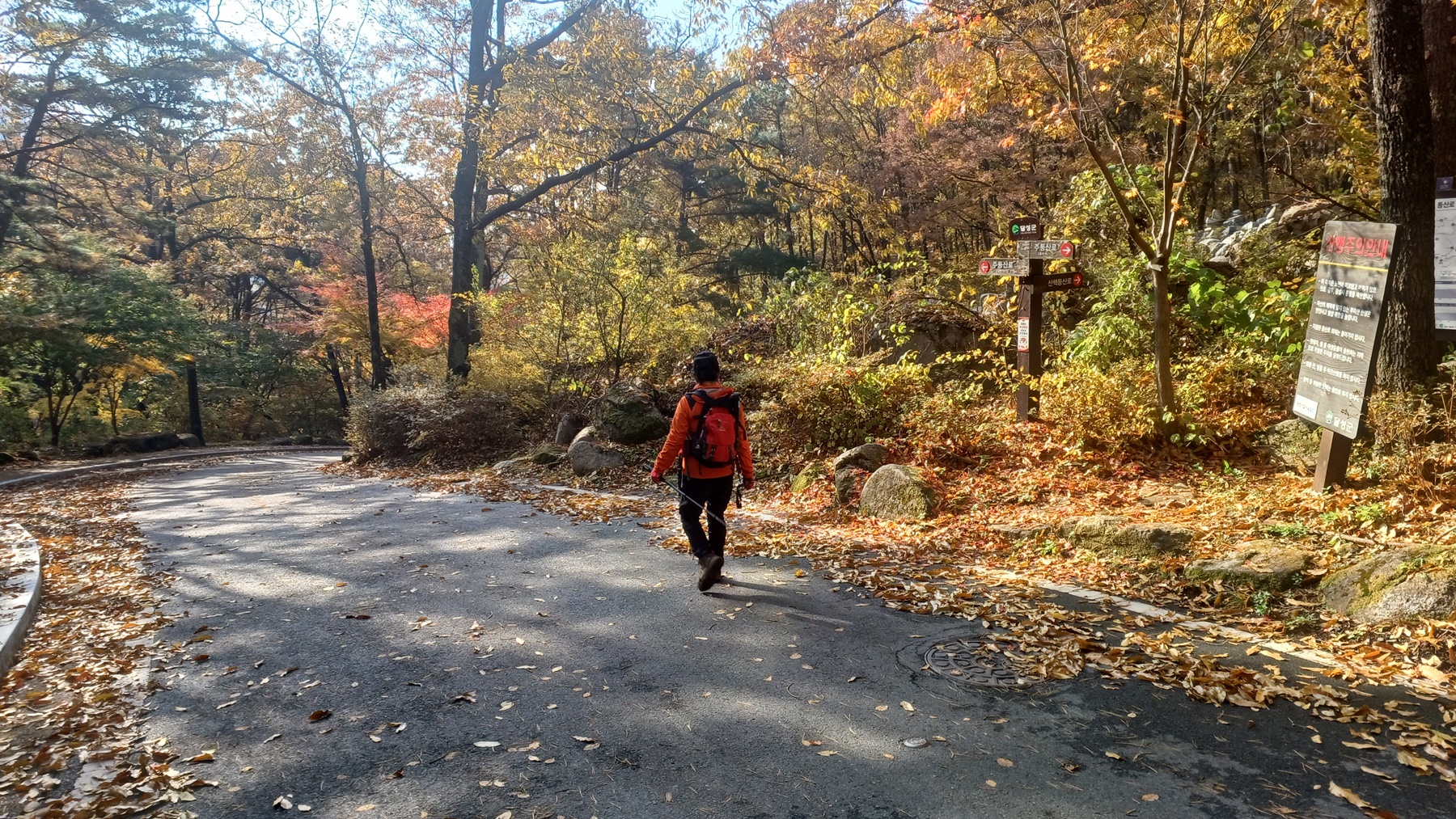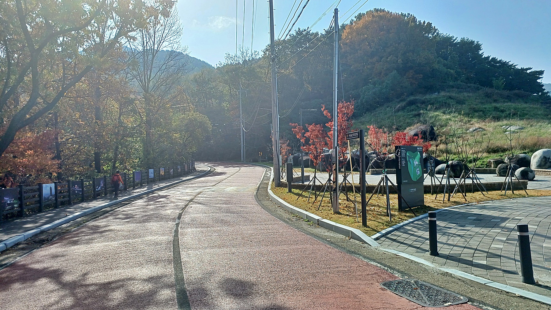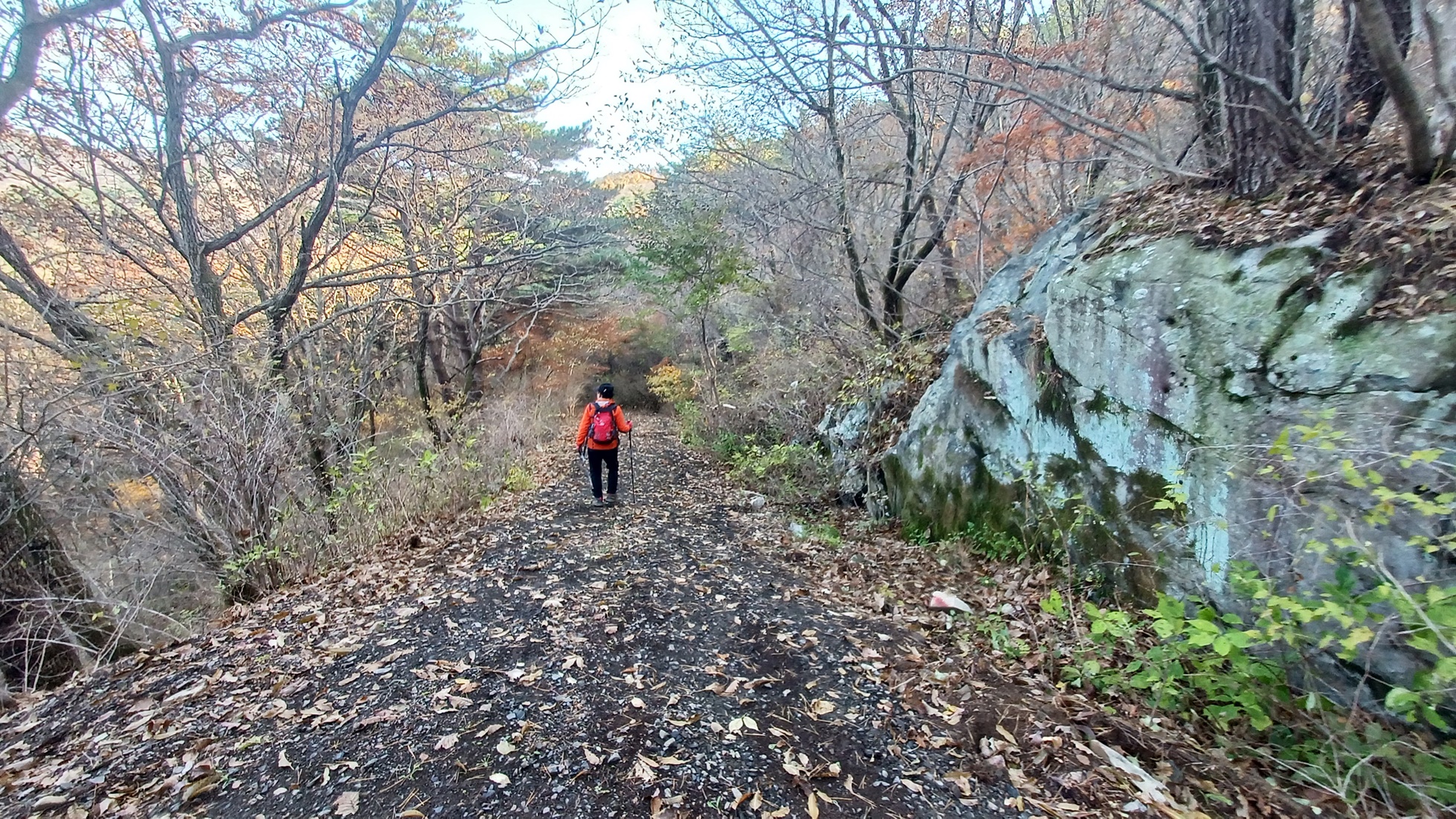 단풍이 붉게 물들은 임도를 따라 내려가면