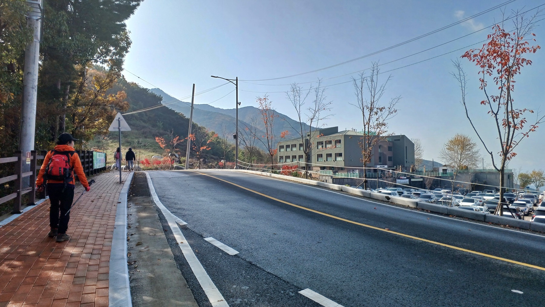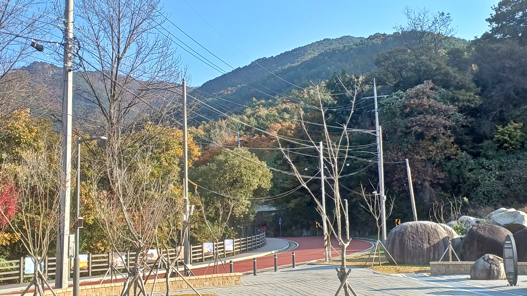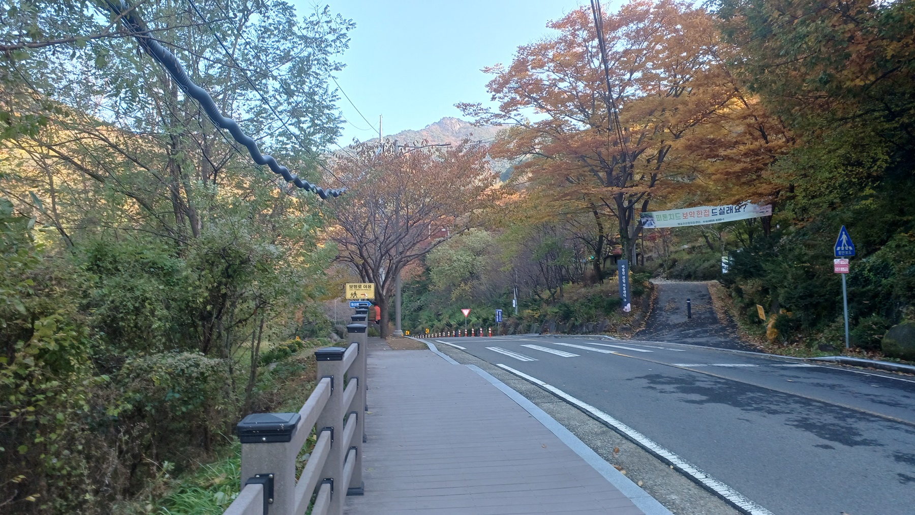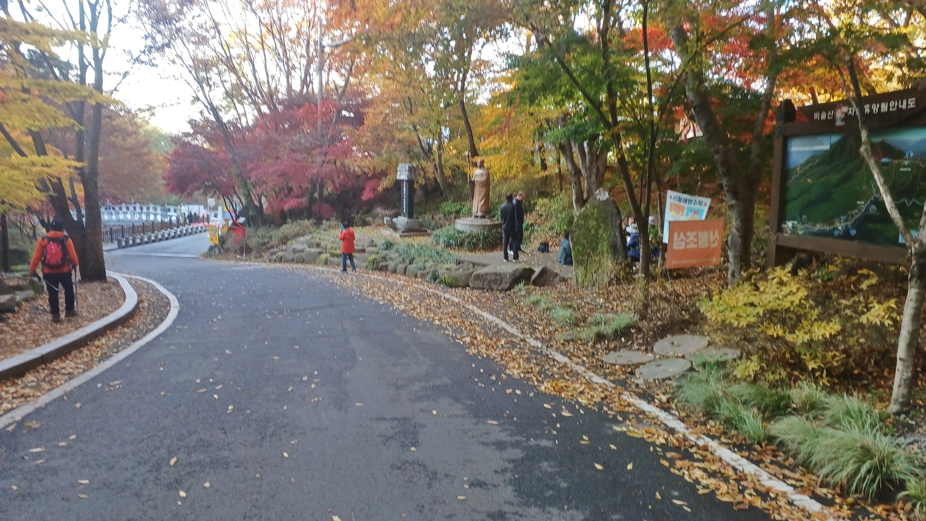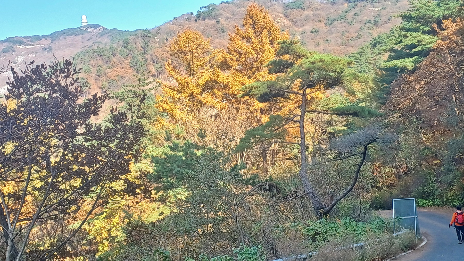 단풍이 붉게 물들은 임도를 따라 내려가면