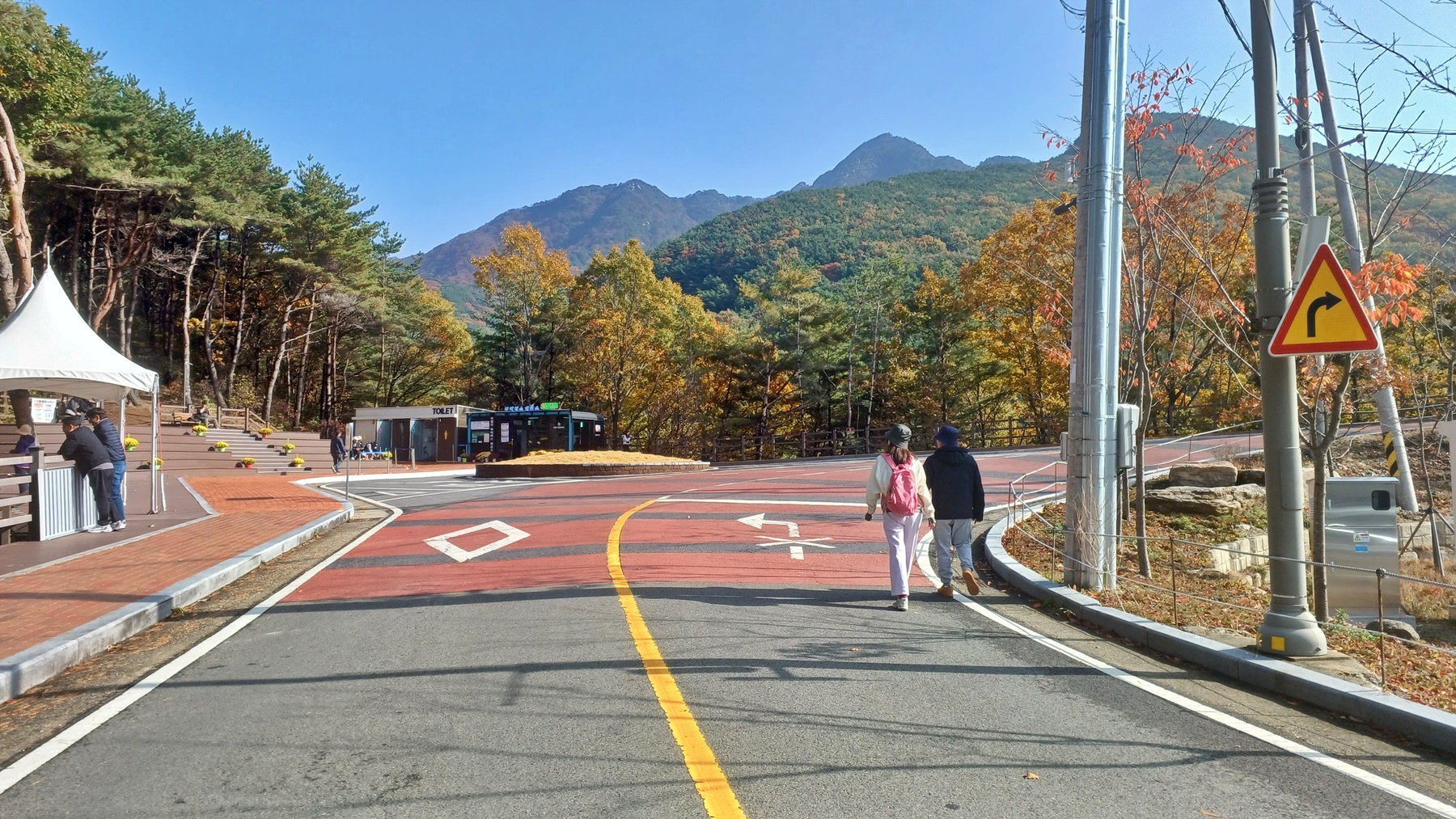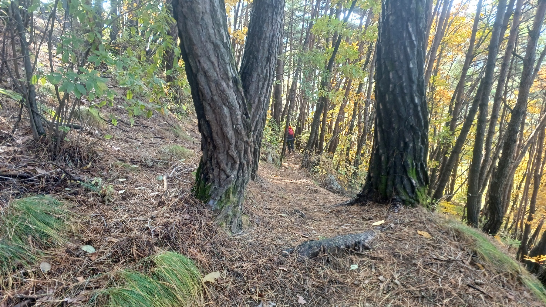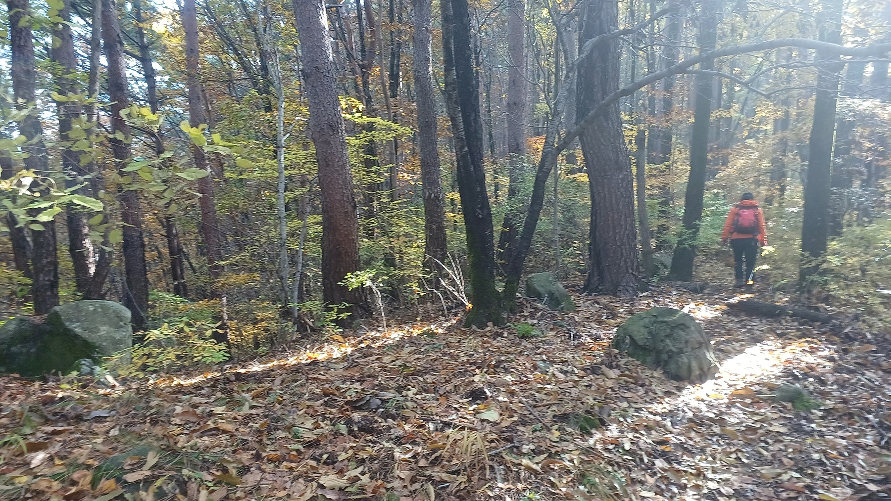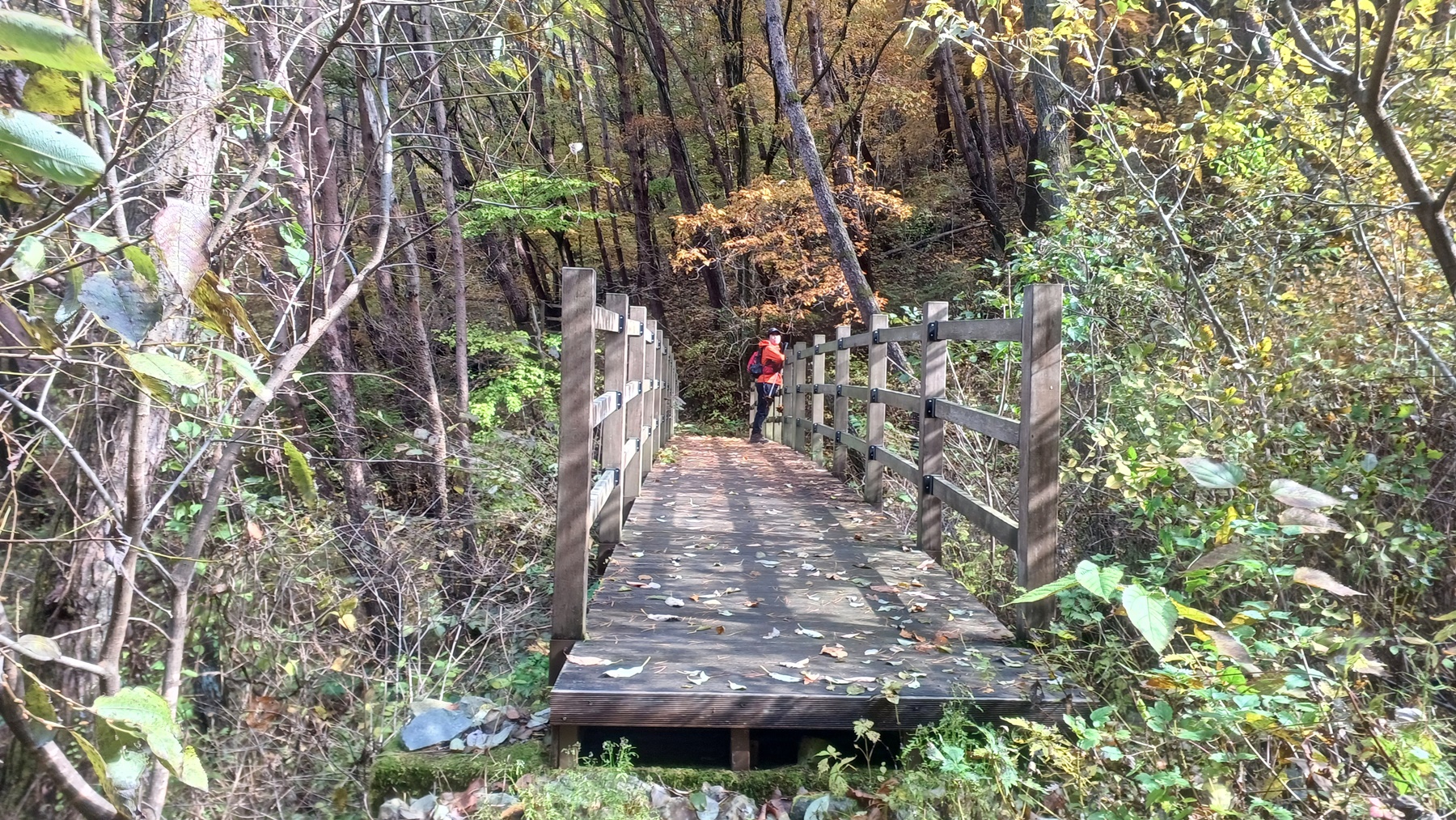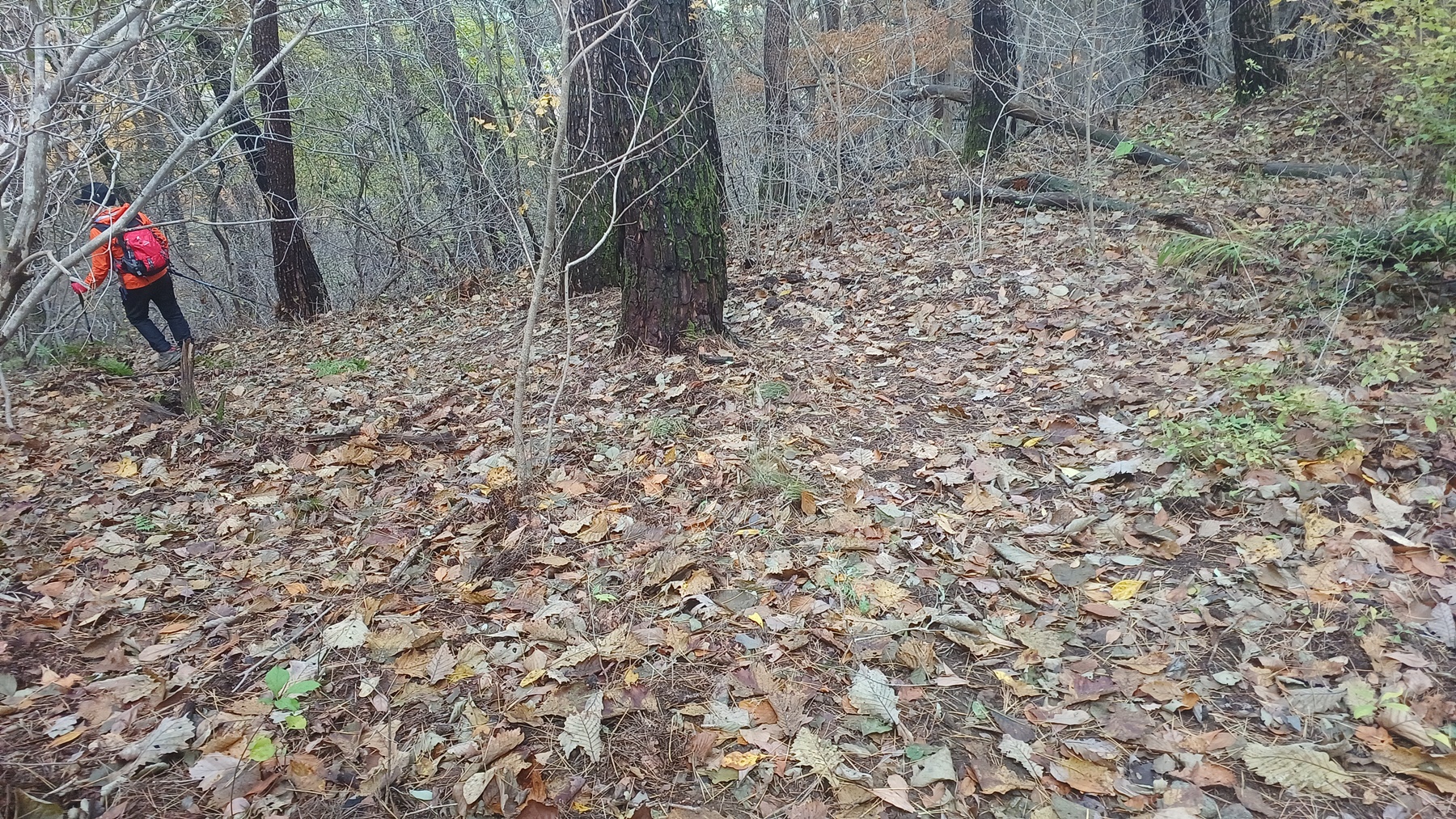단풍이 붉게 물들은 임도를 따라 내려가면