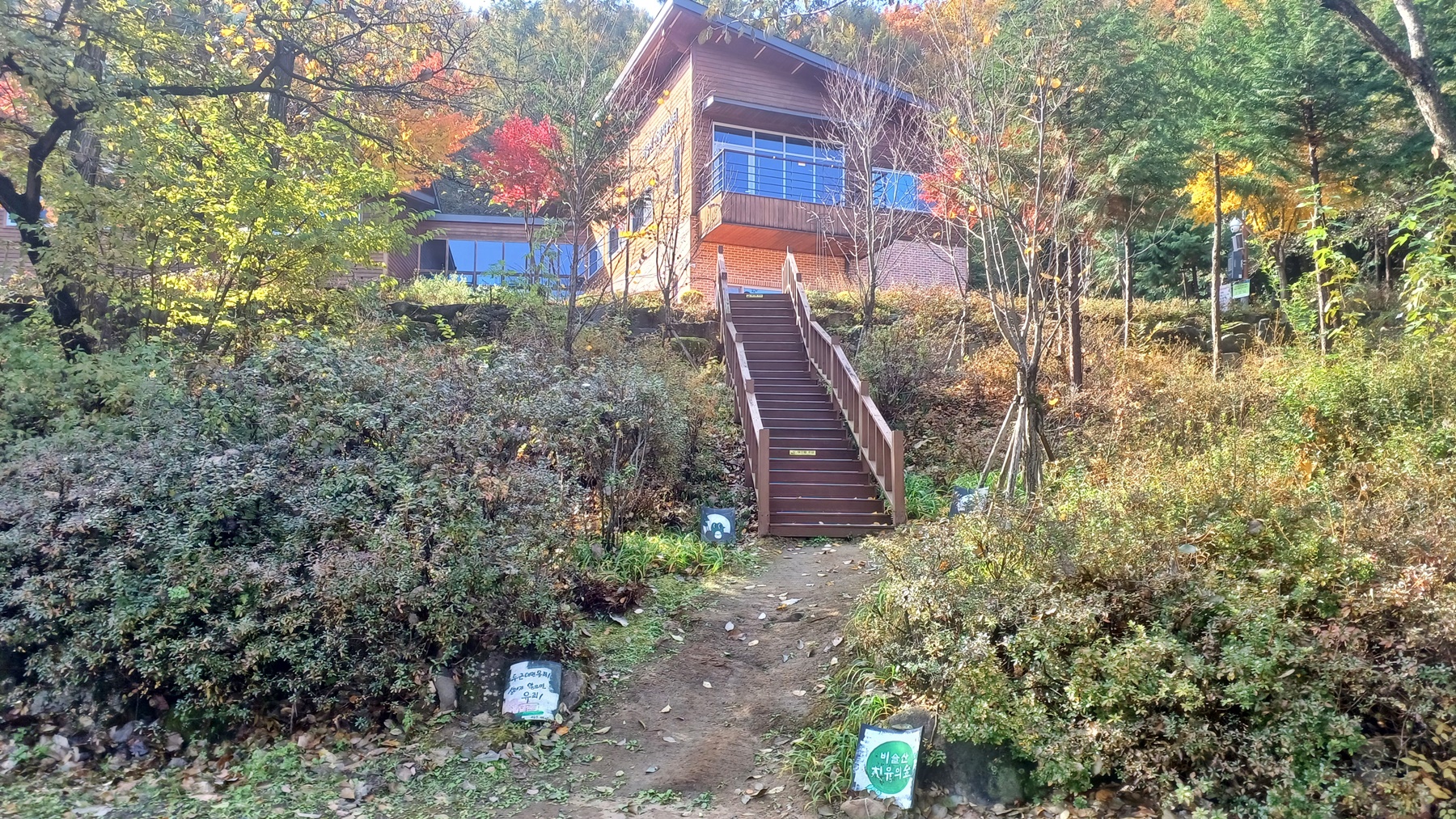 치유 센터로 들어가는 목계단이 보이는데 숲내음길이 시작하는 시점이다.