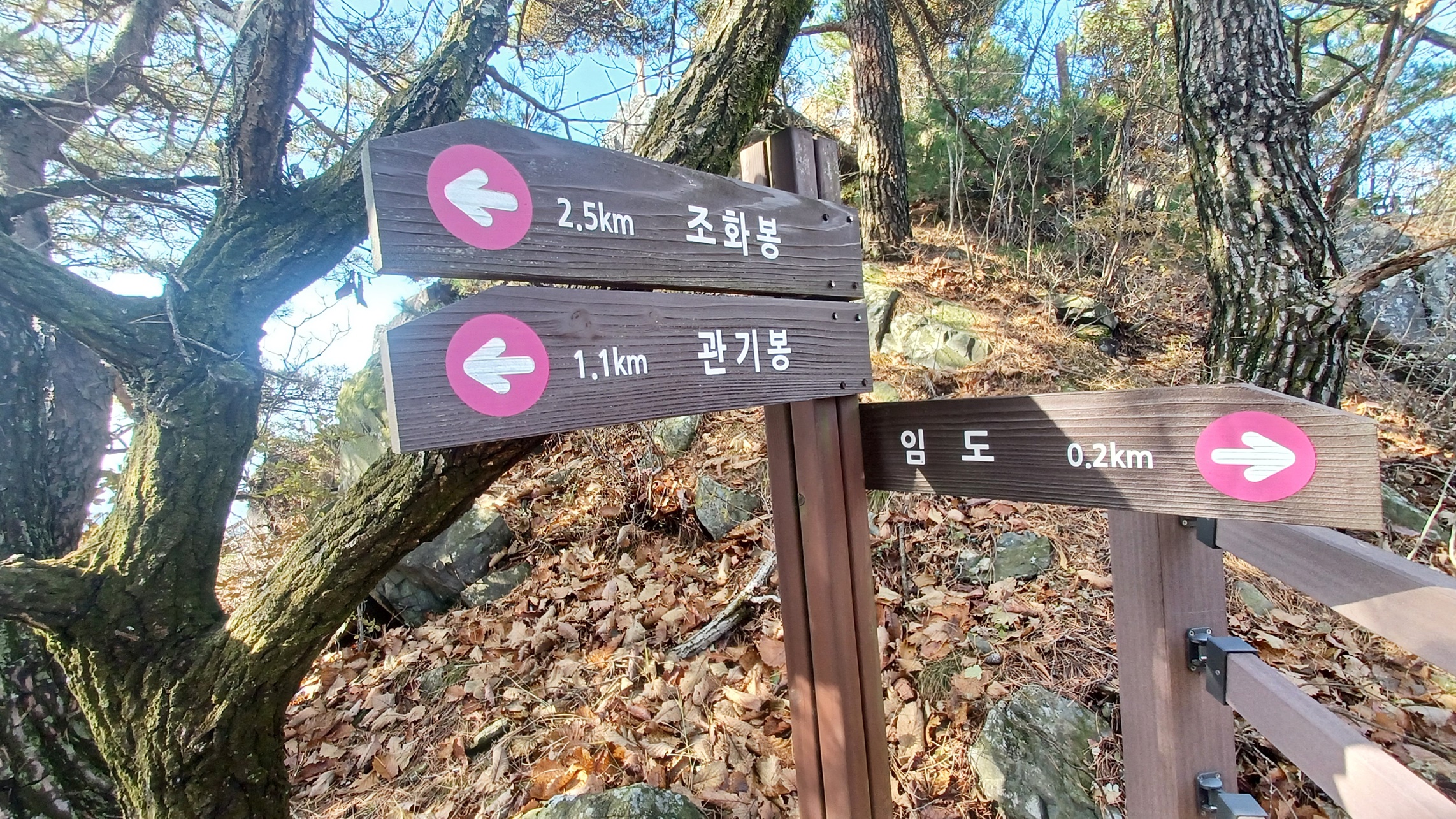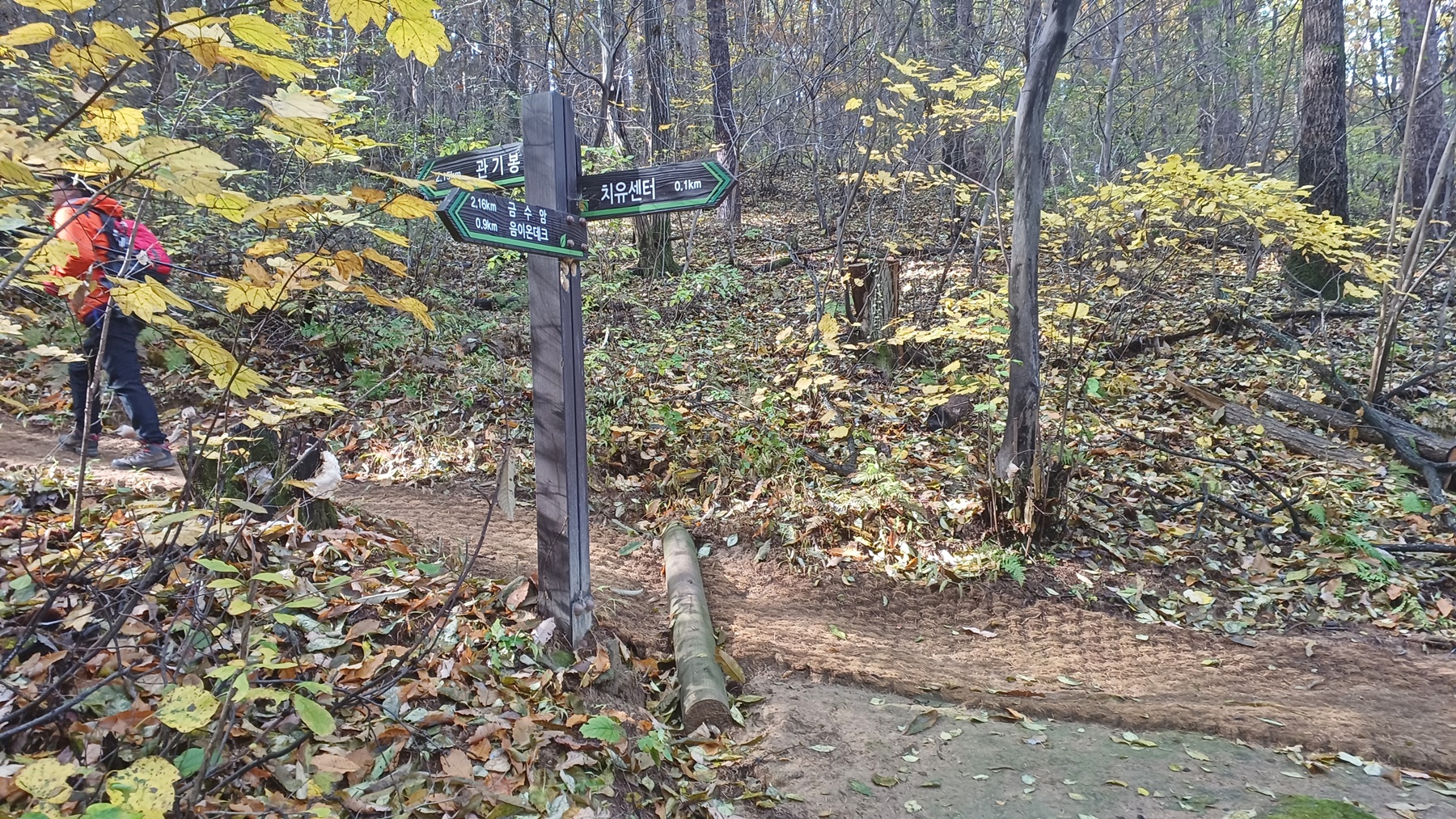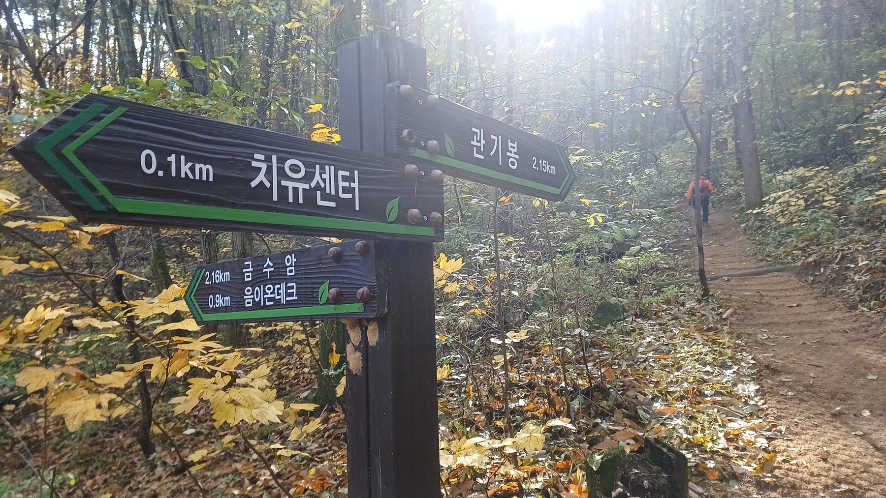 갈림길 이정표(치유센터 0.1km-음이온 데크0.5km/금수암2.16km-관기봉2.15km)를 만나