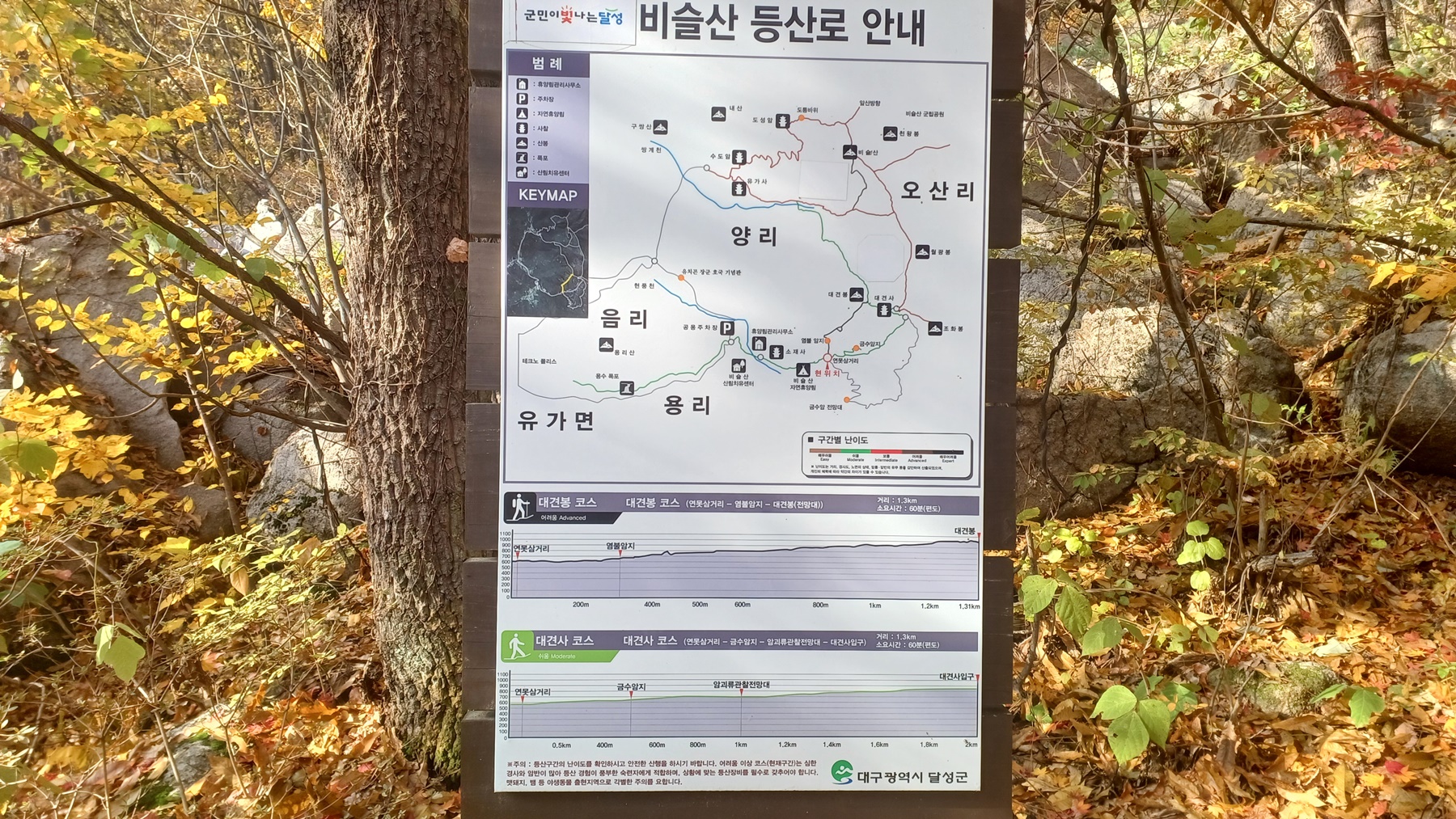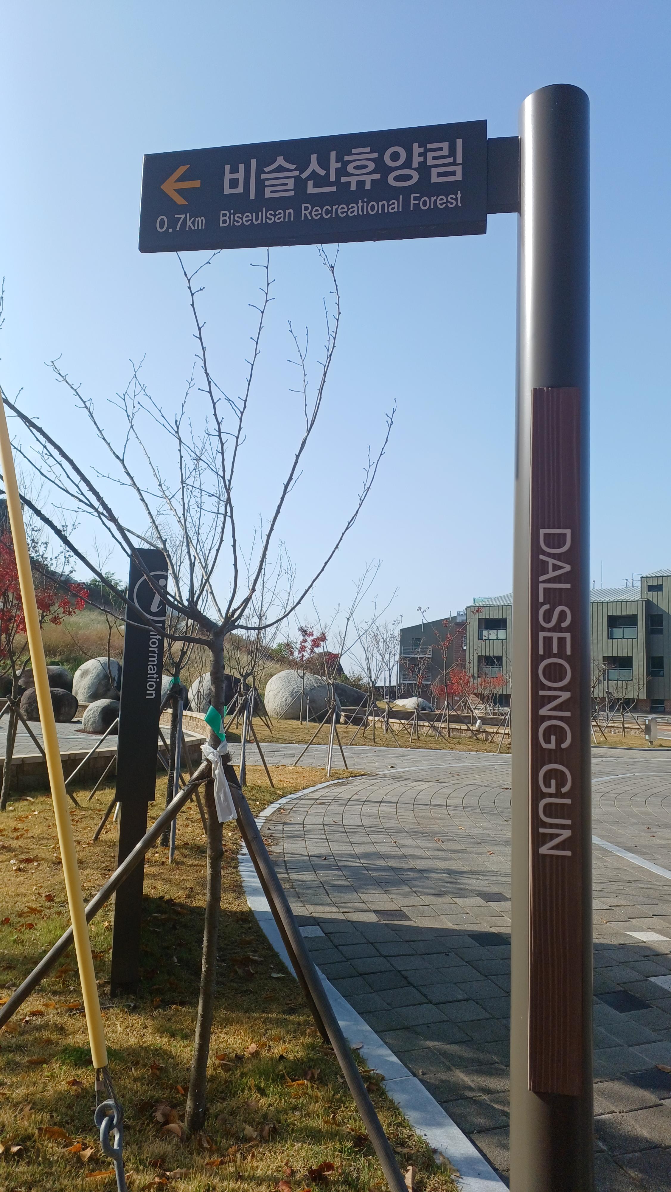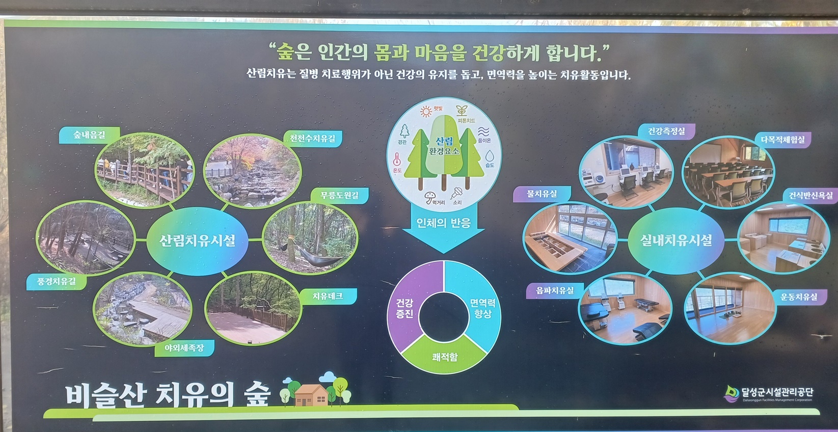 '비슬산 치유의 숲' 안내도와 '산림 치유 시설,실내 치유 시설' 안내도를 지나면