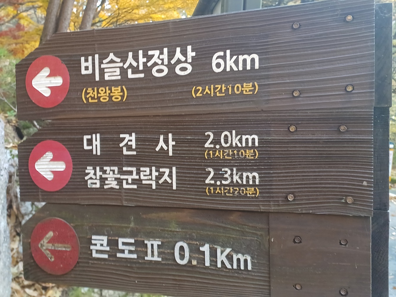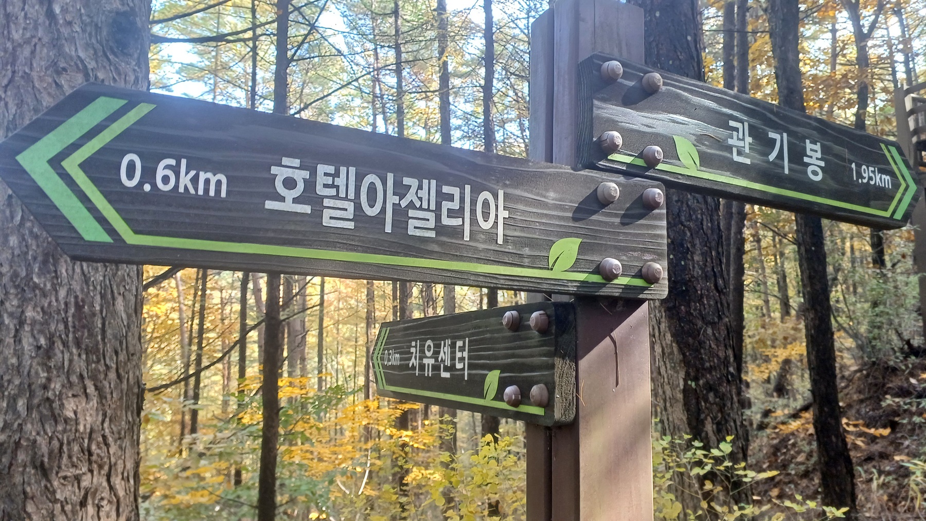 호텔 아젤리아에서 0.6km 오른 지점의 이정표( 호텔아제라이 0.6km-치유센터0.3km-관기봉 1.992km)다.