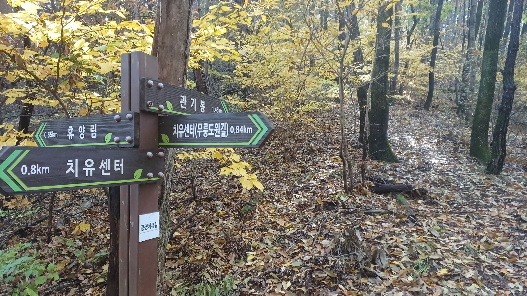 풍욕장의 이정표(치유센터-무릉도원길0.84km-치유센터 0.8km-휴양림0.5km-관기봉1.45km)에서