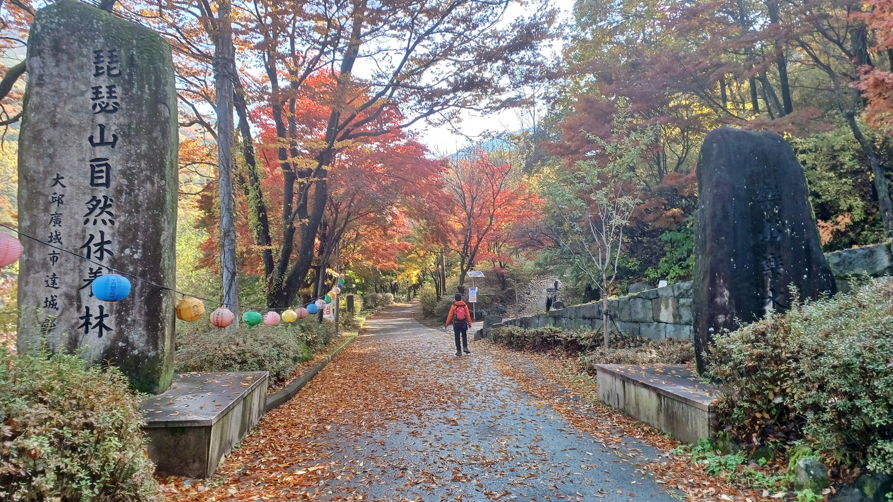 두 개(비슬산 자연 휴양림/요산요수)의 입석 사이를 지나