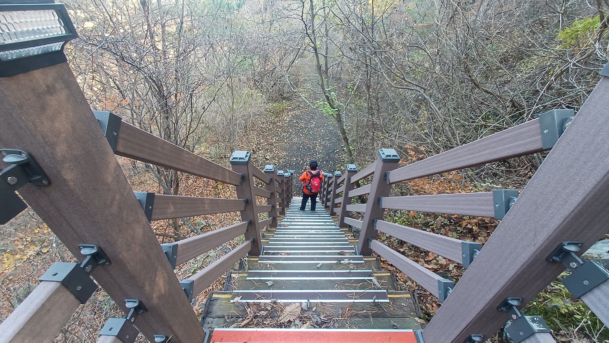 금수암 전망대에서 조망 후 임도 방향으로 급경사 데크 계단을 내려가면