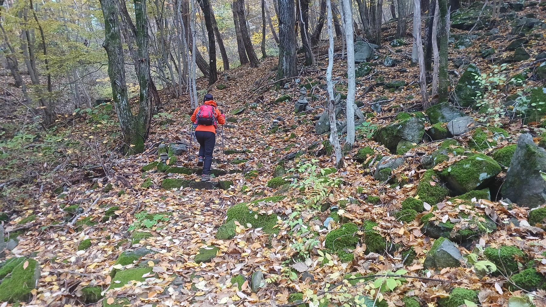 이끼가 낀 바위를 따라 산사면길을 내려기면